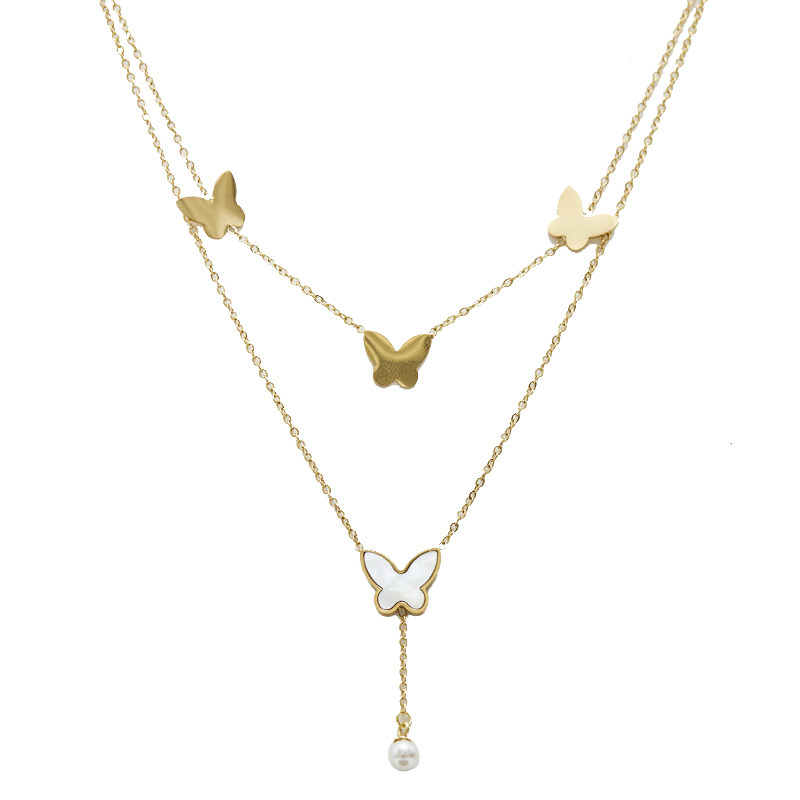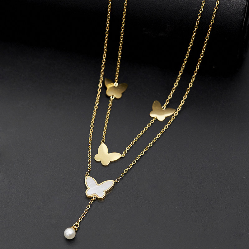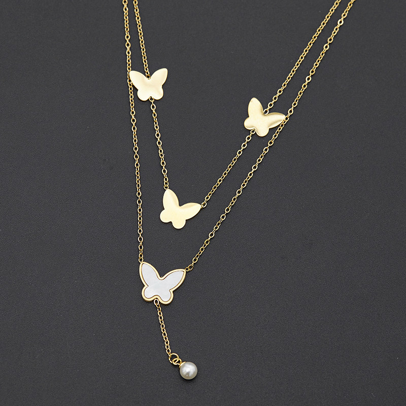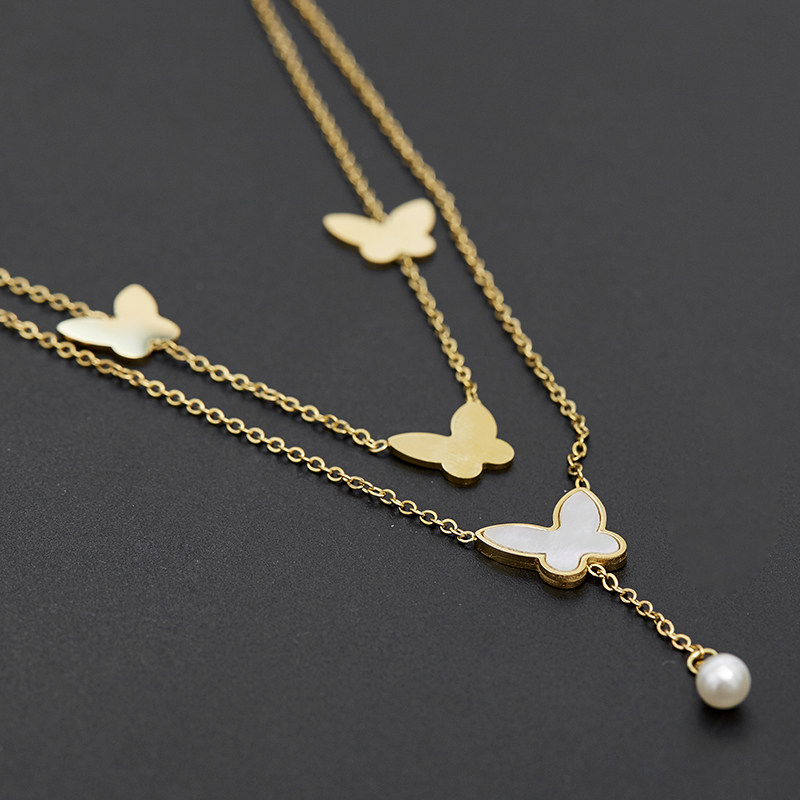 日韩甜美时尚气质光面蝴蝶贝壳长款流苏珍珠坠双层项链钛钢锁骨链
