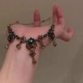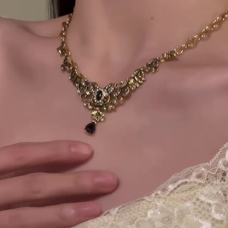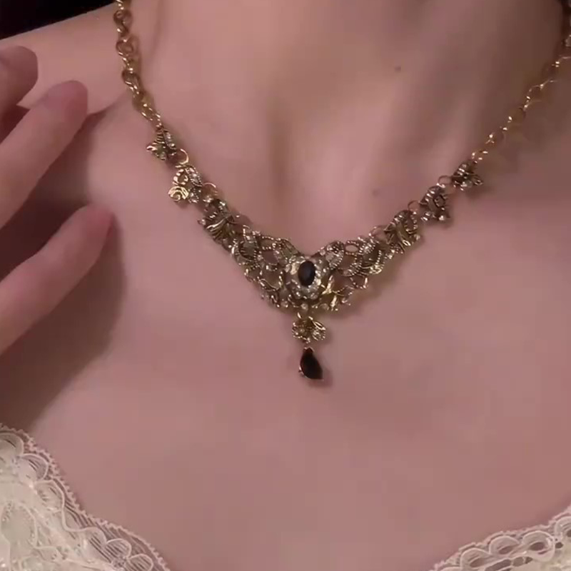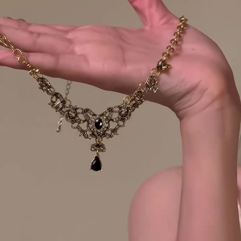 复古vintage宫廷风黑色水晶流苏项链女2025爆款做旧锁骨链choker