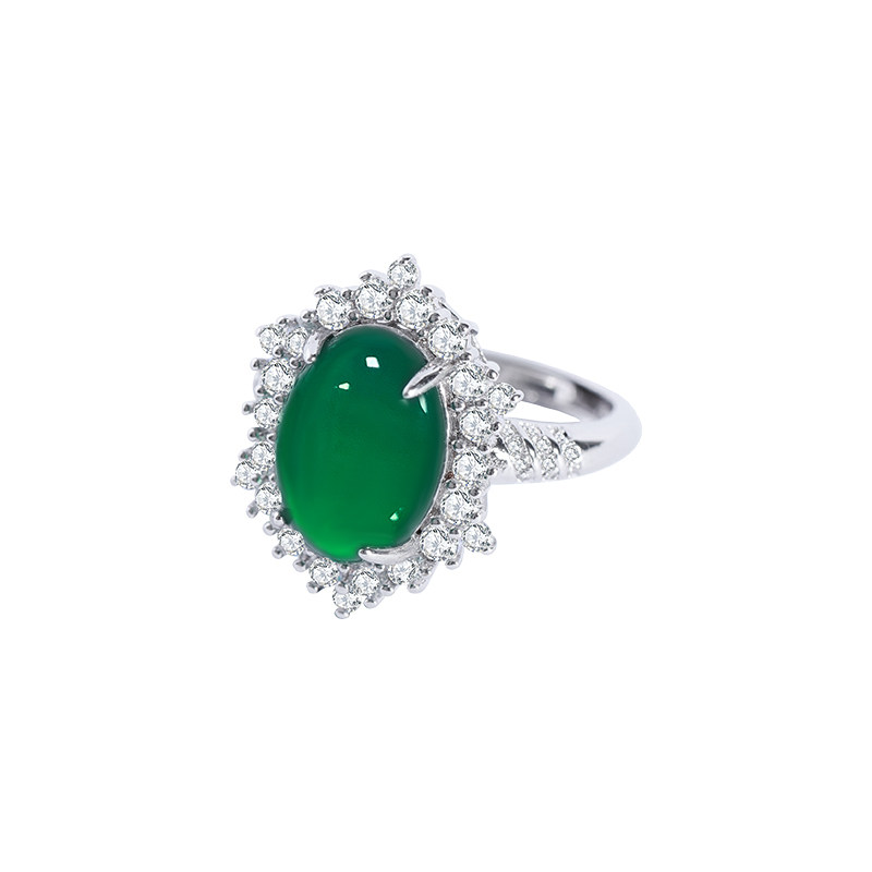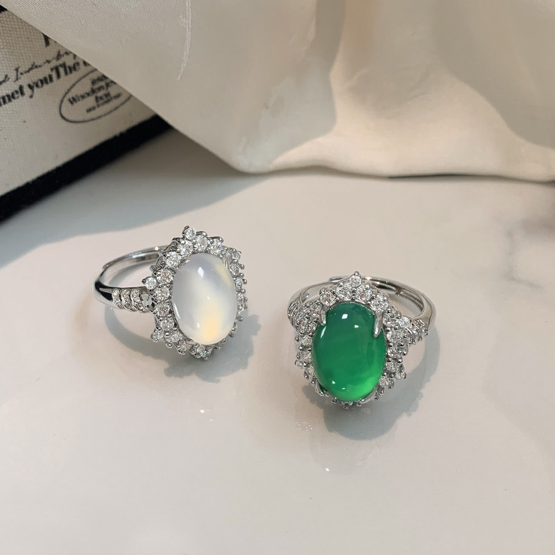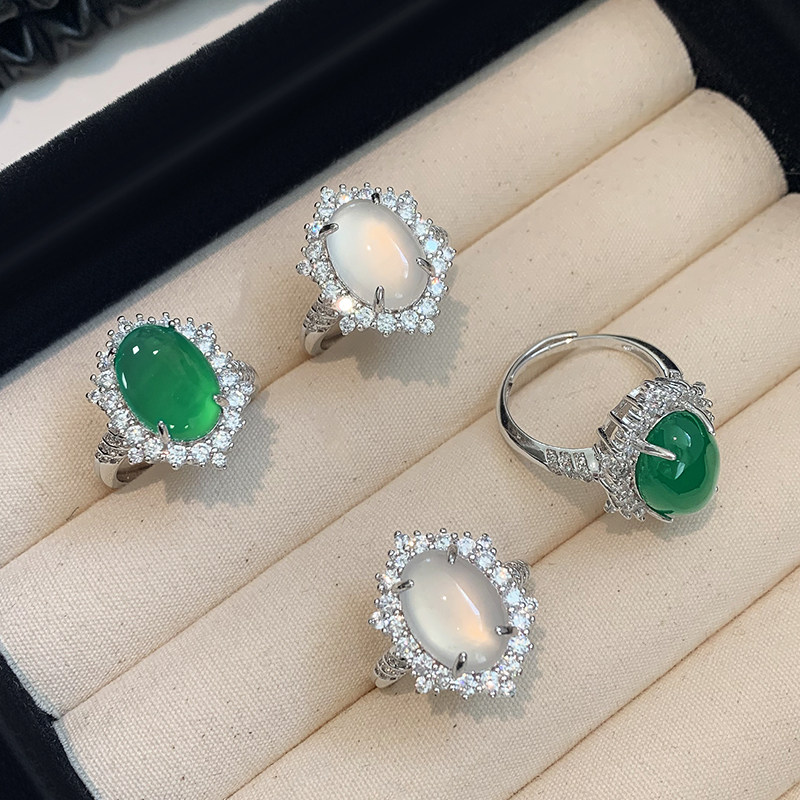 天然绿色玉髓白玛瑙玉石戒指女小众设计轻奢高级感新中式新款指环