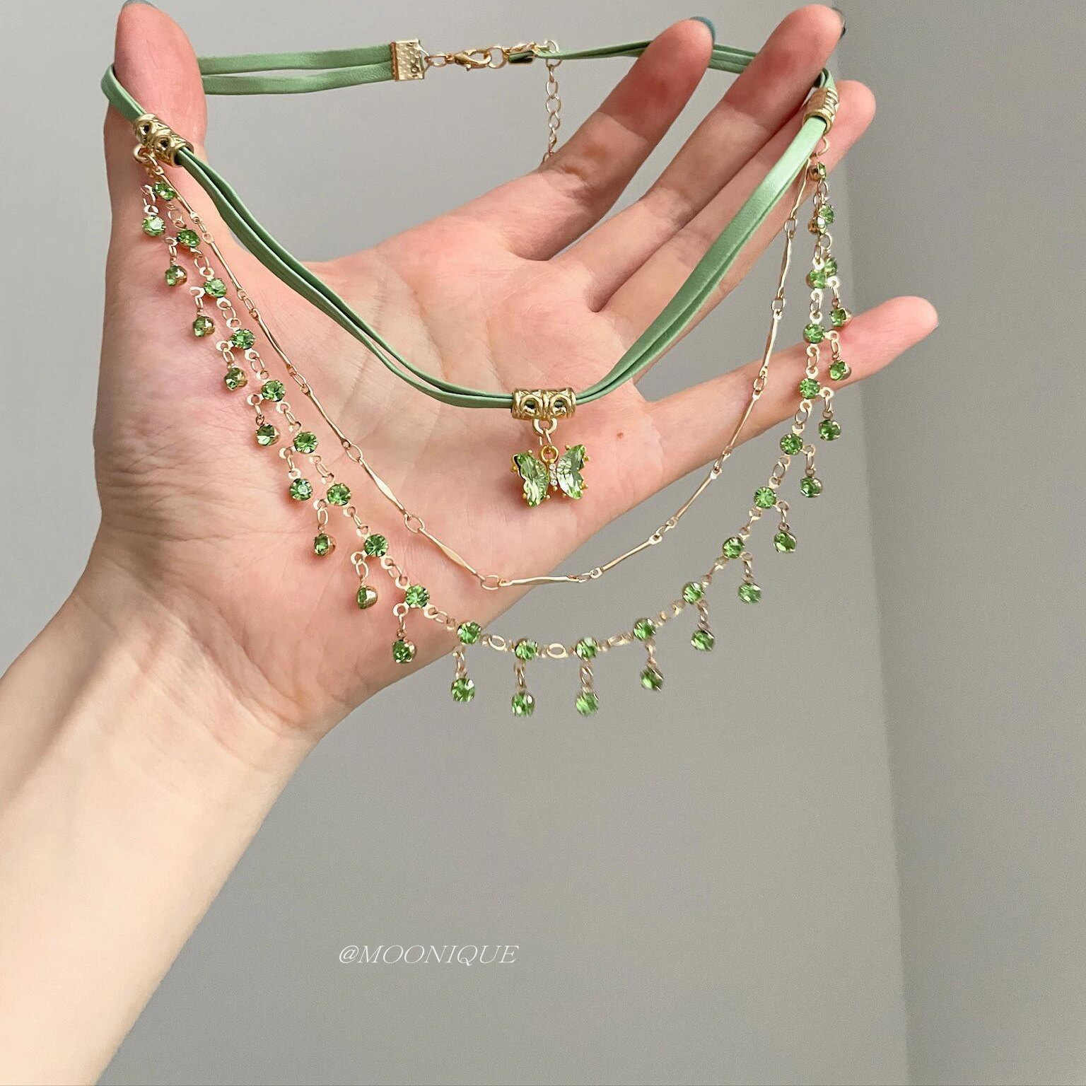 绿色蝴蝶多层流苏项链女夏日小清新森系锁骨链甜酷风多层叠戴颈链