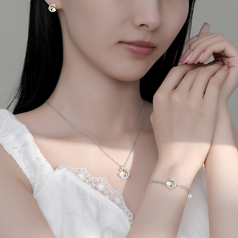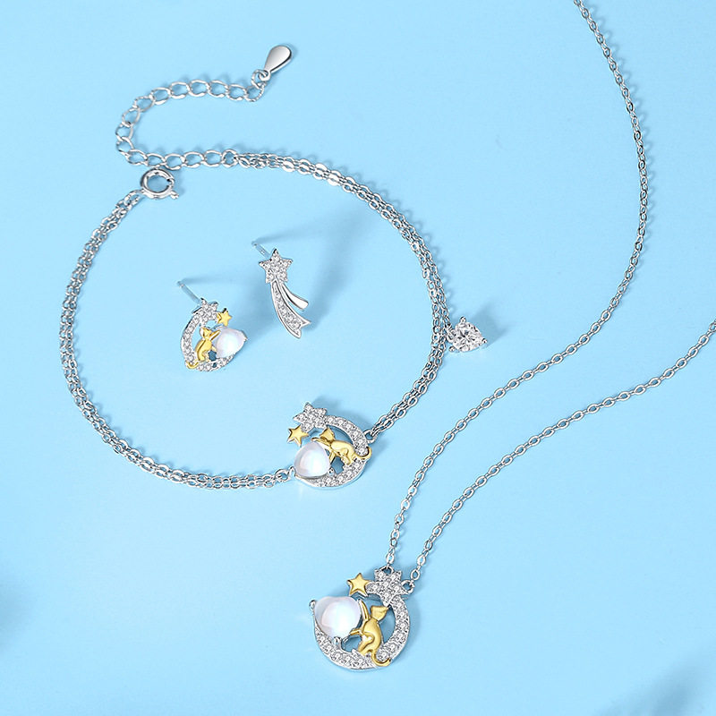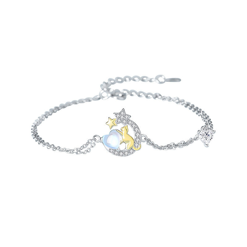原创星月猫手链女纯银小众少女心夏季百搭手环韩版爱心月光石手饰