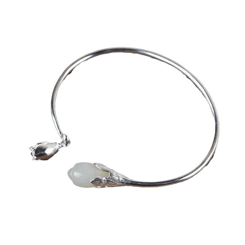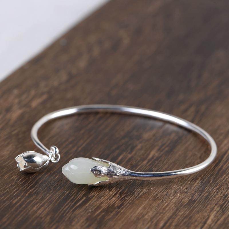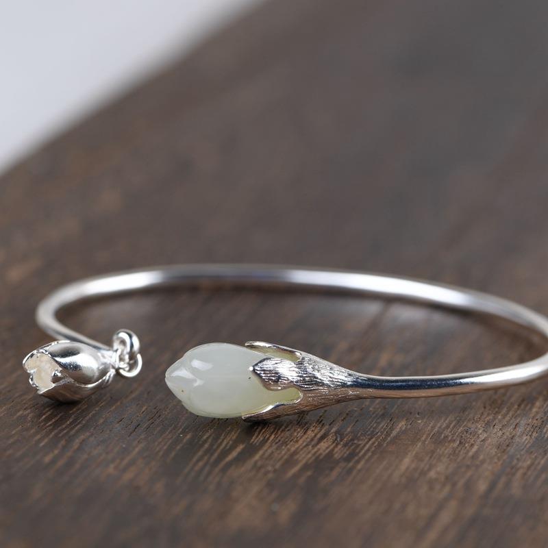 网红-925银和田玉手镯女款开口国潮旗袍汉服银饰花卉银手环