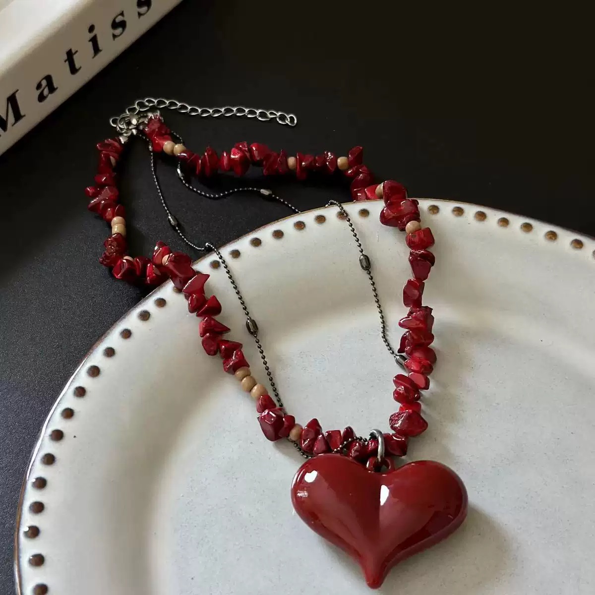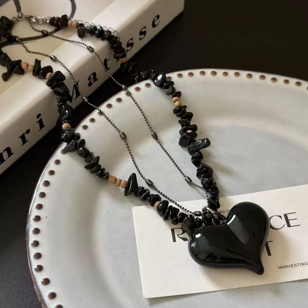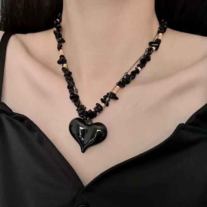 暗黑风大爱心碎石不规则串珠项链女新款小众高级感叠戴锁骨链颈链