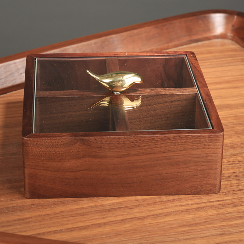 创意胡桃木饰品收纳盒家居客厅干果盘带盖分格储物盒糖果盒坚果盘