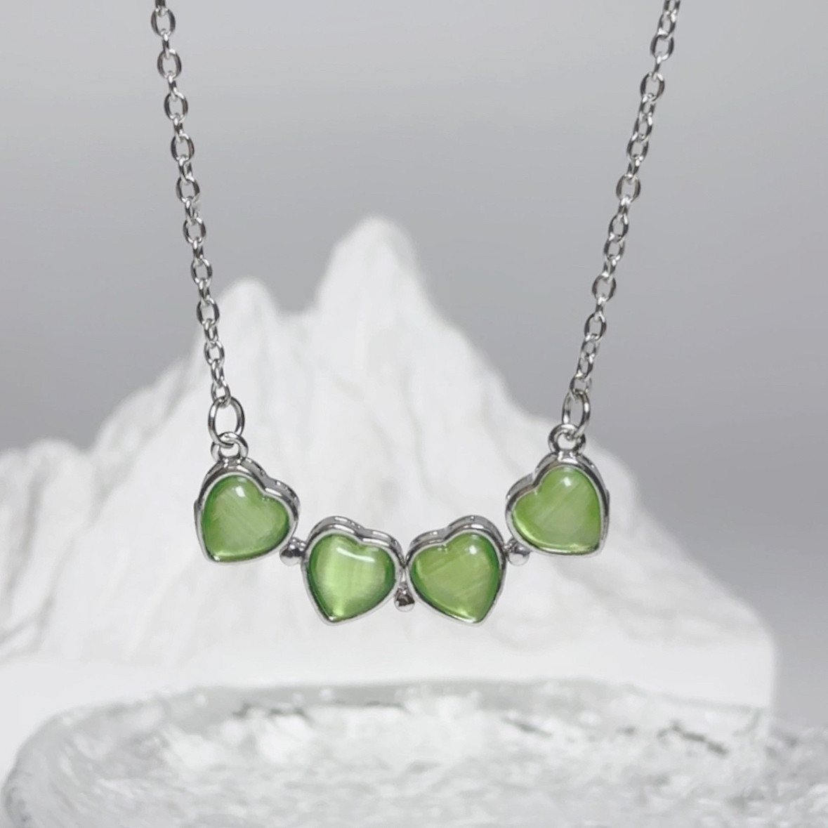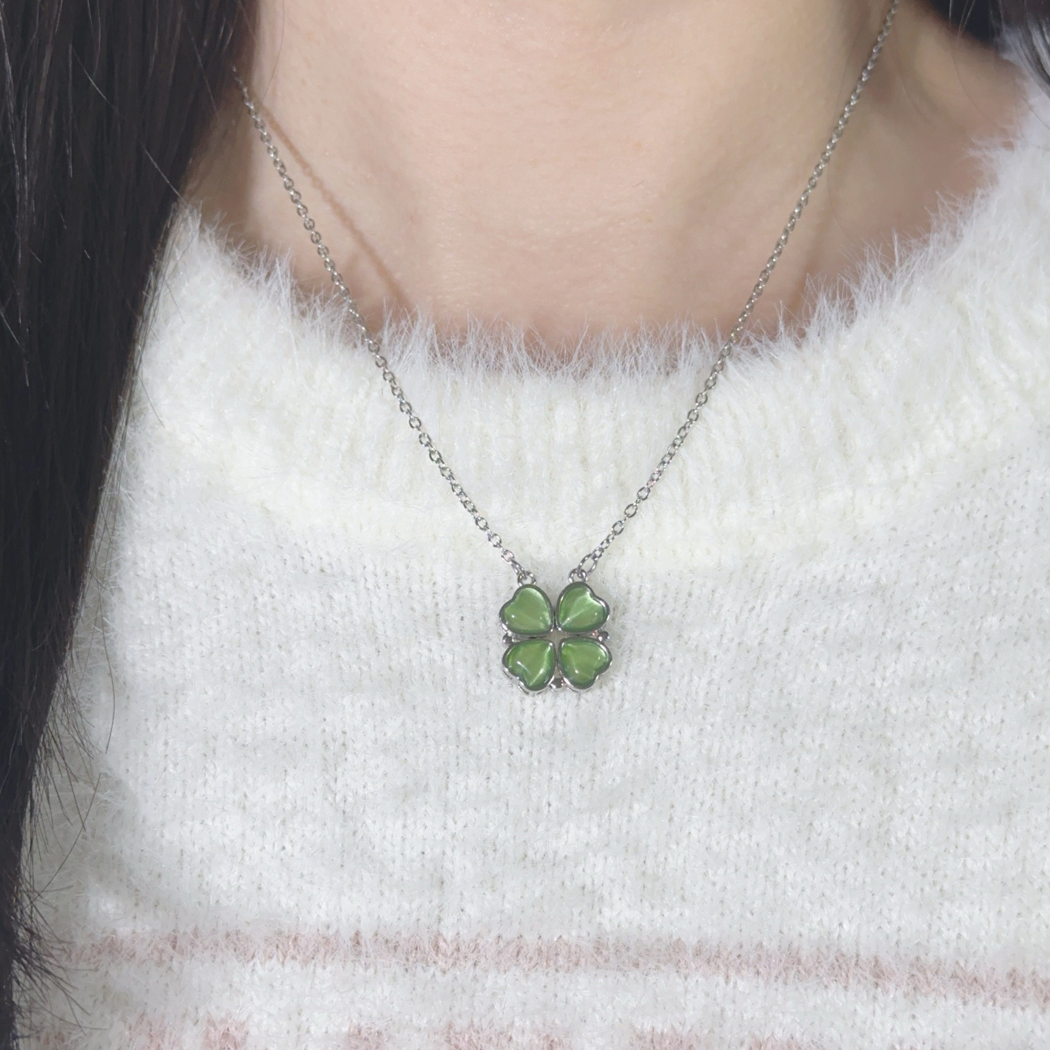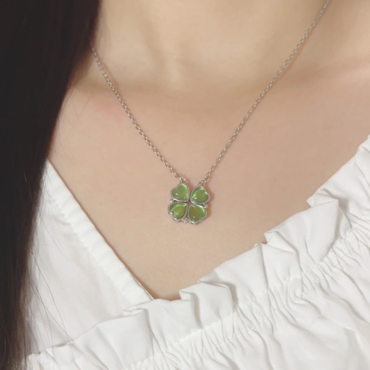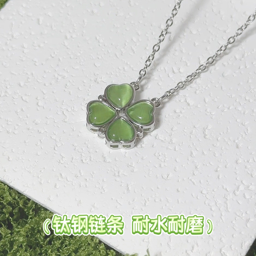 HOWEET爱心四叶草项链磁吸多种戴法猫眼石吊坠绿色小众设计钛钢链