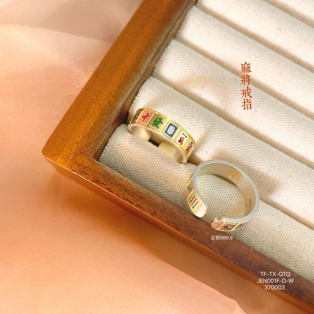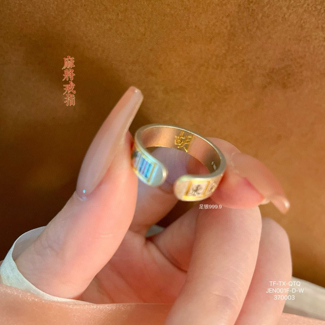 足银9999描金麻将戒指男女款时尚新中式开口可调节纯银戒子送闺蜜
