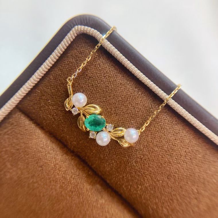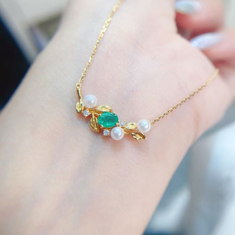 18k金镶嵌祖母绿天然钻石搭海水珍珠项链,附证书