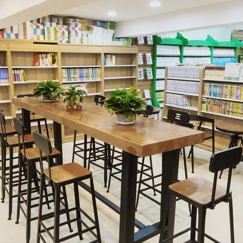 实木吧台桌奶茶店家用定制带靠背长条桌铁艺高脚凳商用一体靠墙桌