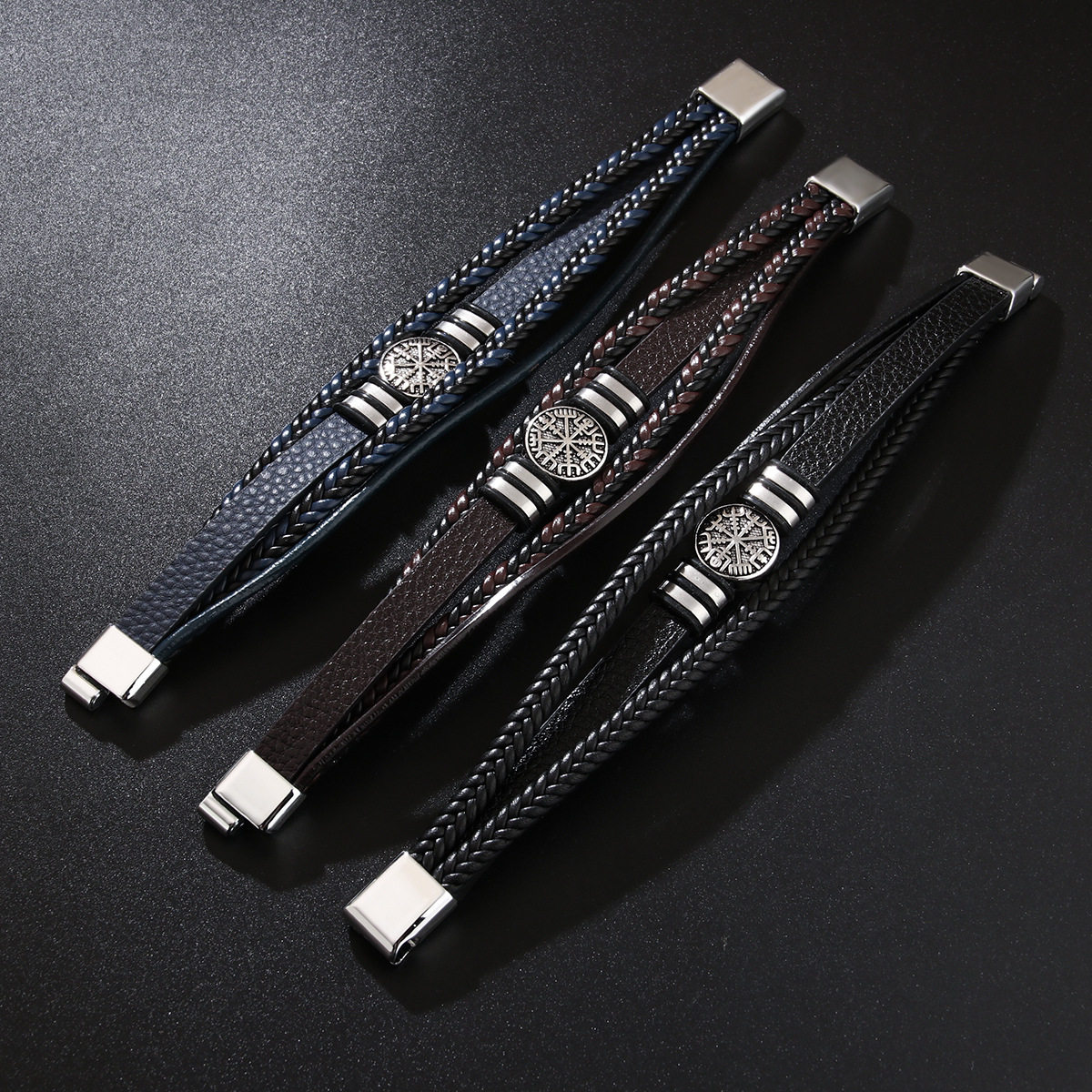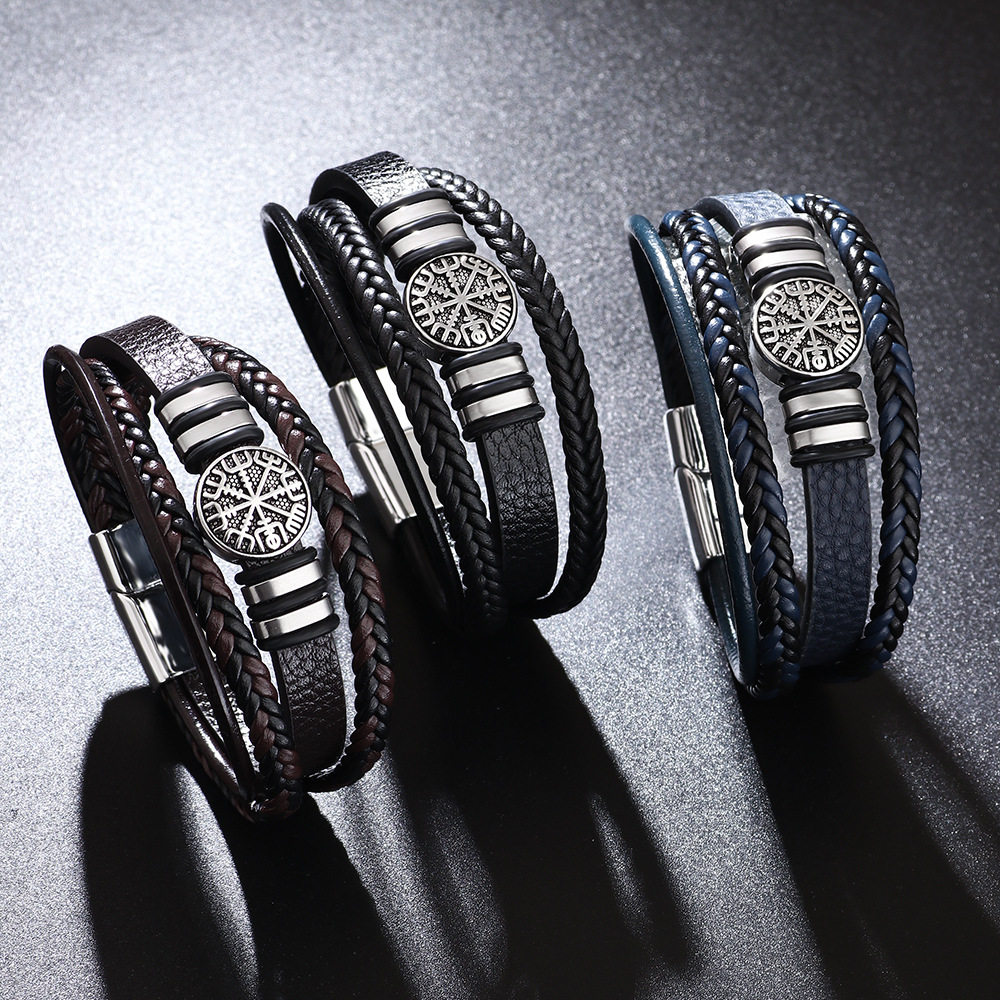 编织皮绳手链时尚朋克风多层男士手环时尚潮流指南针个性手镯