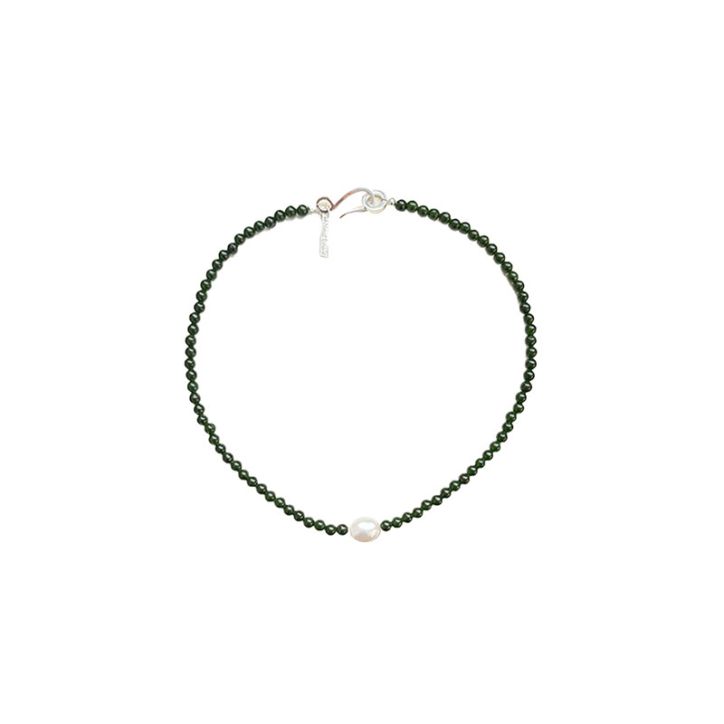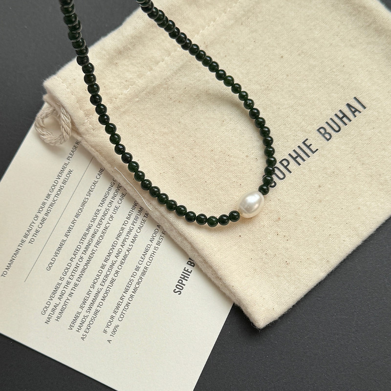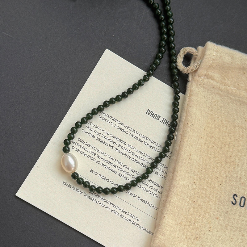 Sophie *uha复古项链天然淡水珍珠锁骨链手工墨绿色玉髓串珠颈链