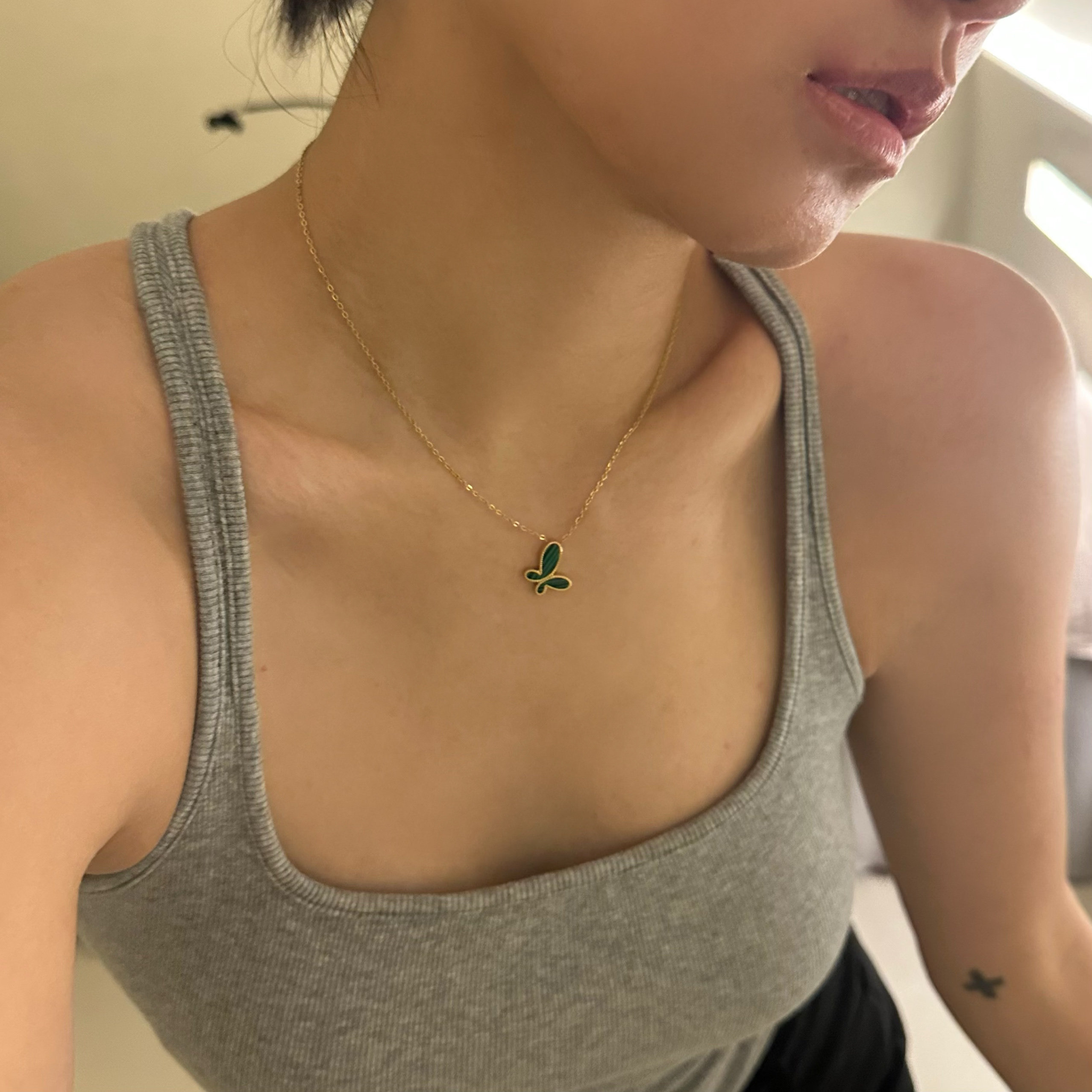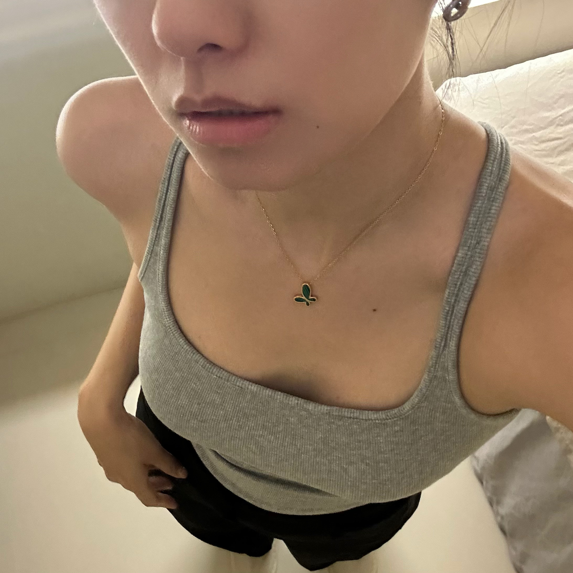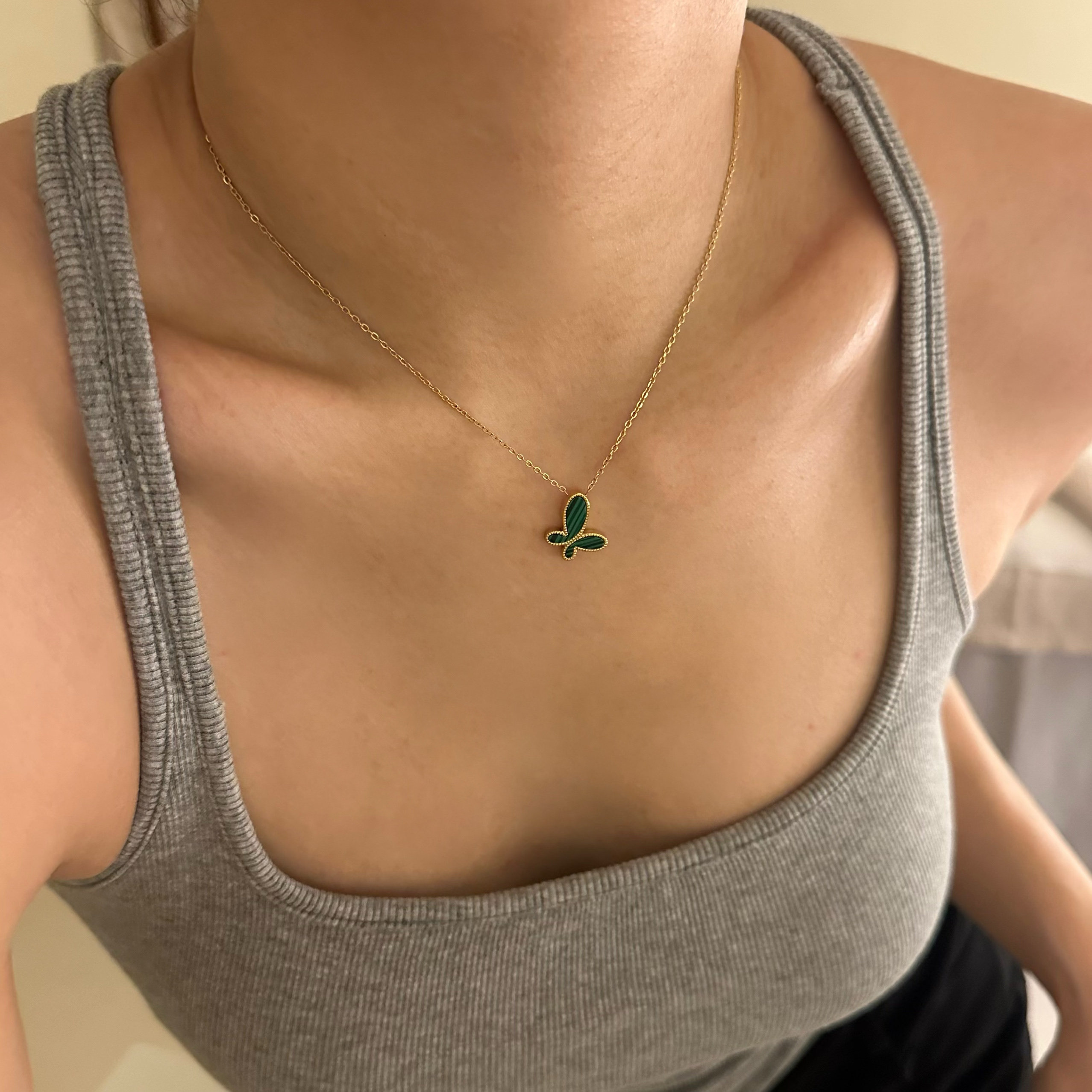 734钛钢可洗澡复古法式锁骨链绿色孔雀石蝴蝶吊坠项链叠搭颈链