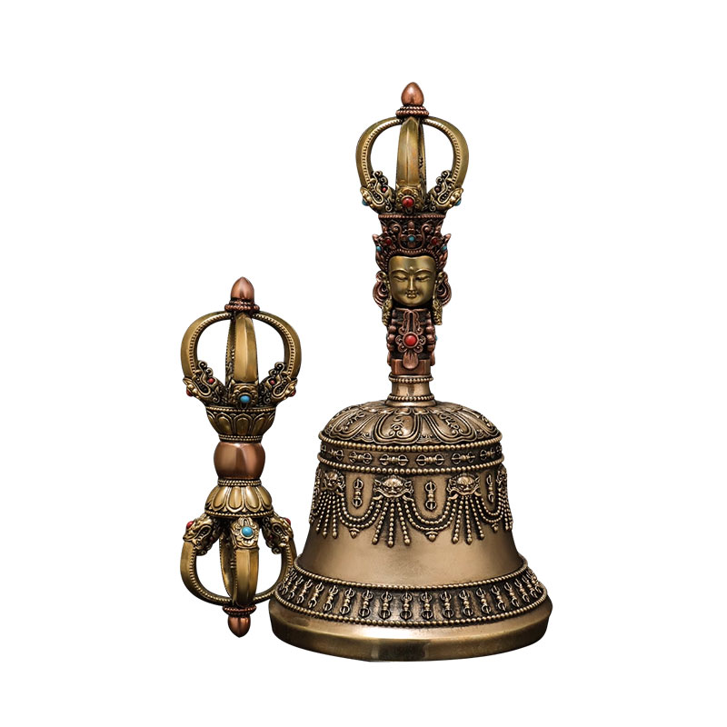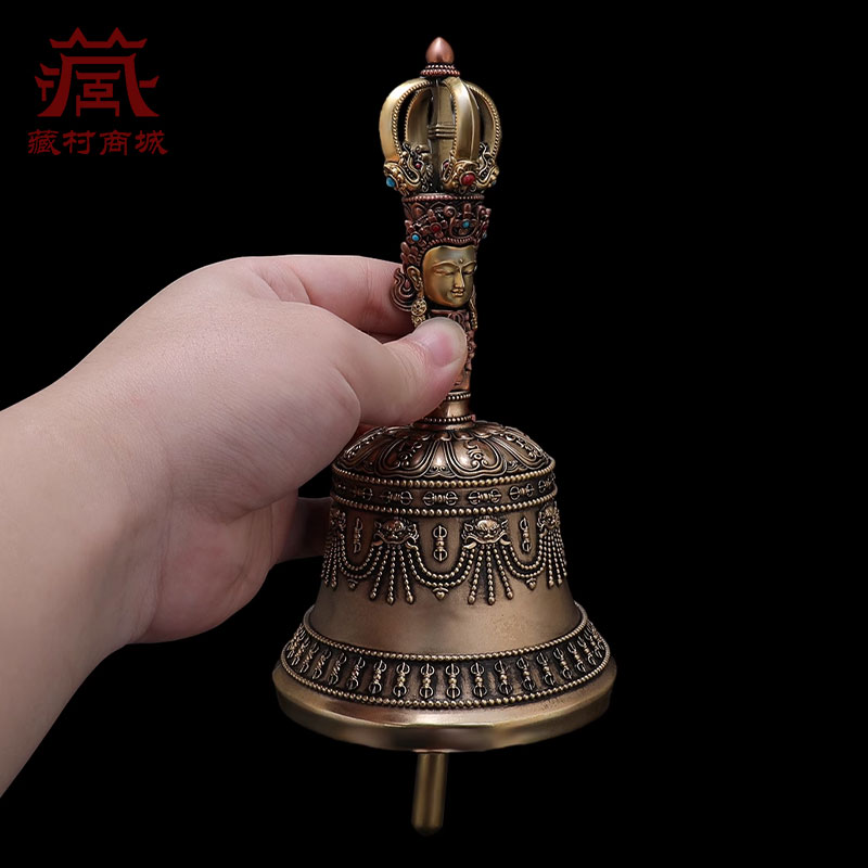 藏村五股金刚铃杵室内家用八吉祥雕花彩珠镶嵌金刚橛铜摆件