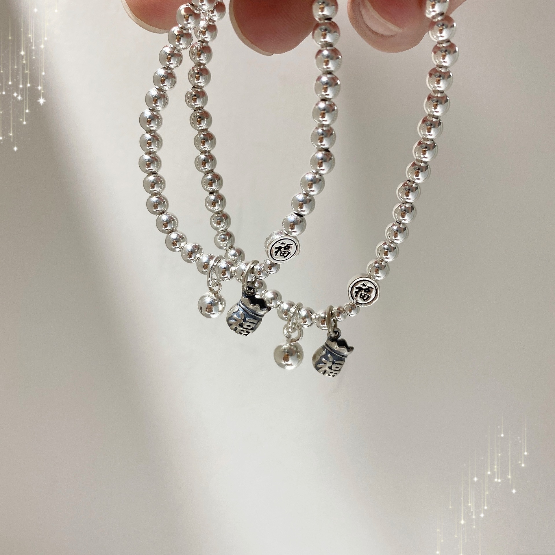 香港正生纯银S925纯银光珠福字铃铛福袋亲子款手链手串创意时尚D