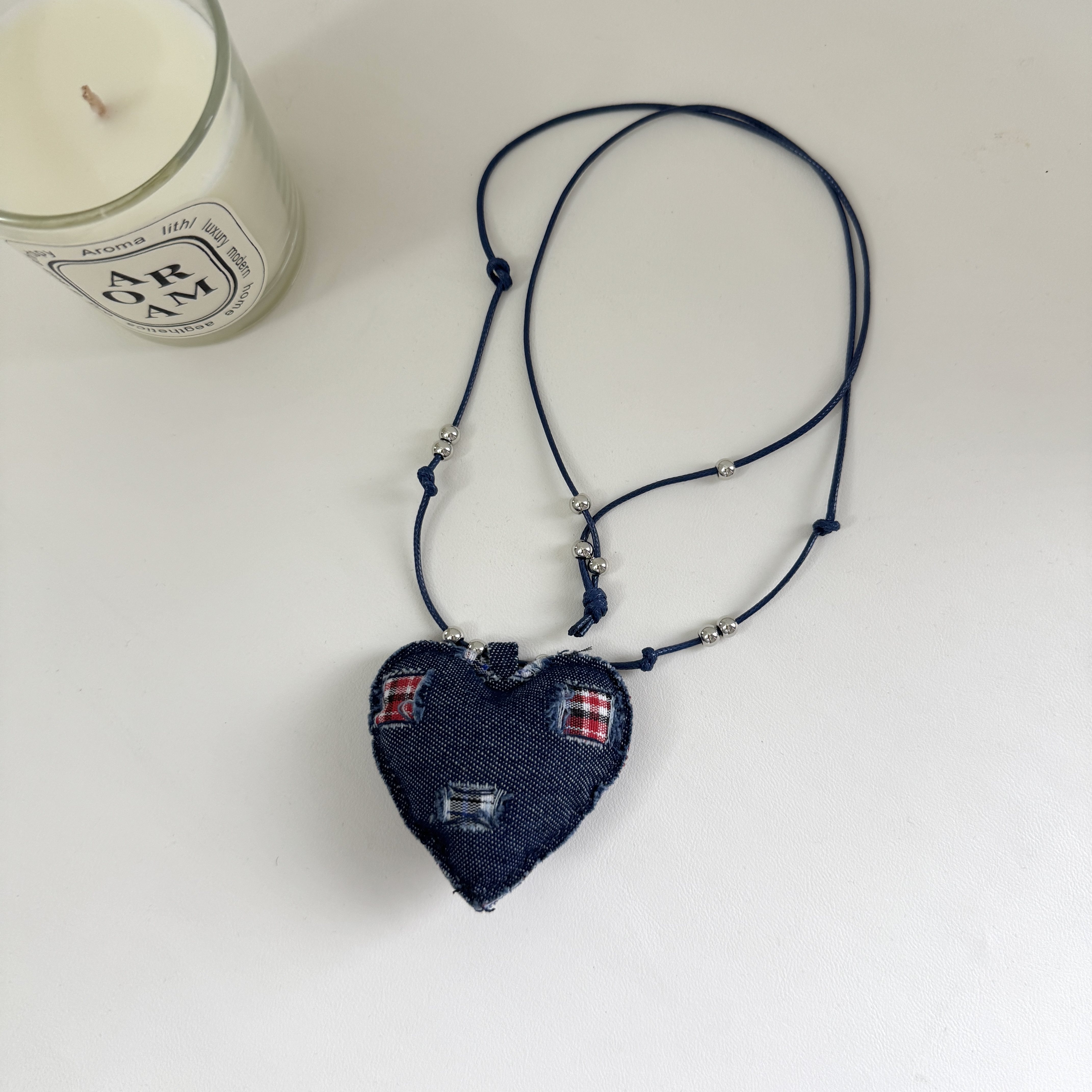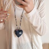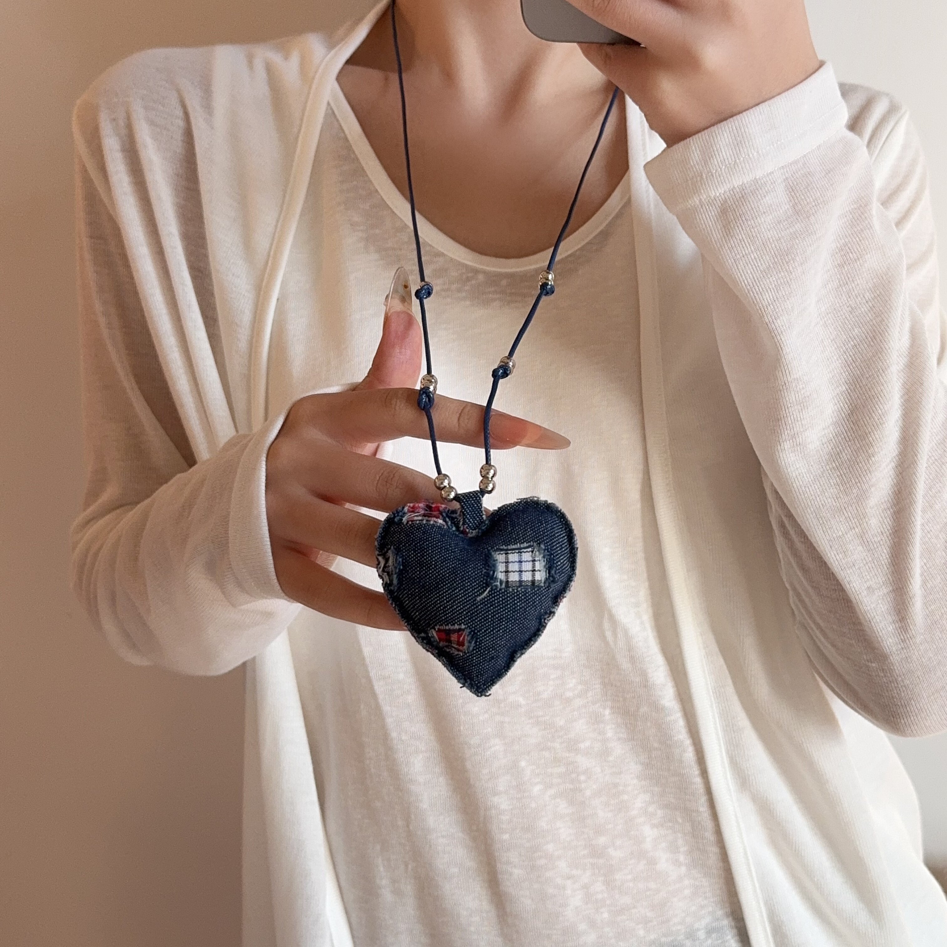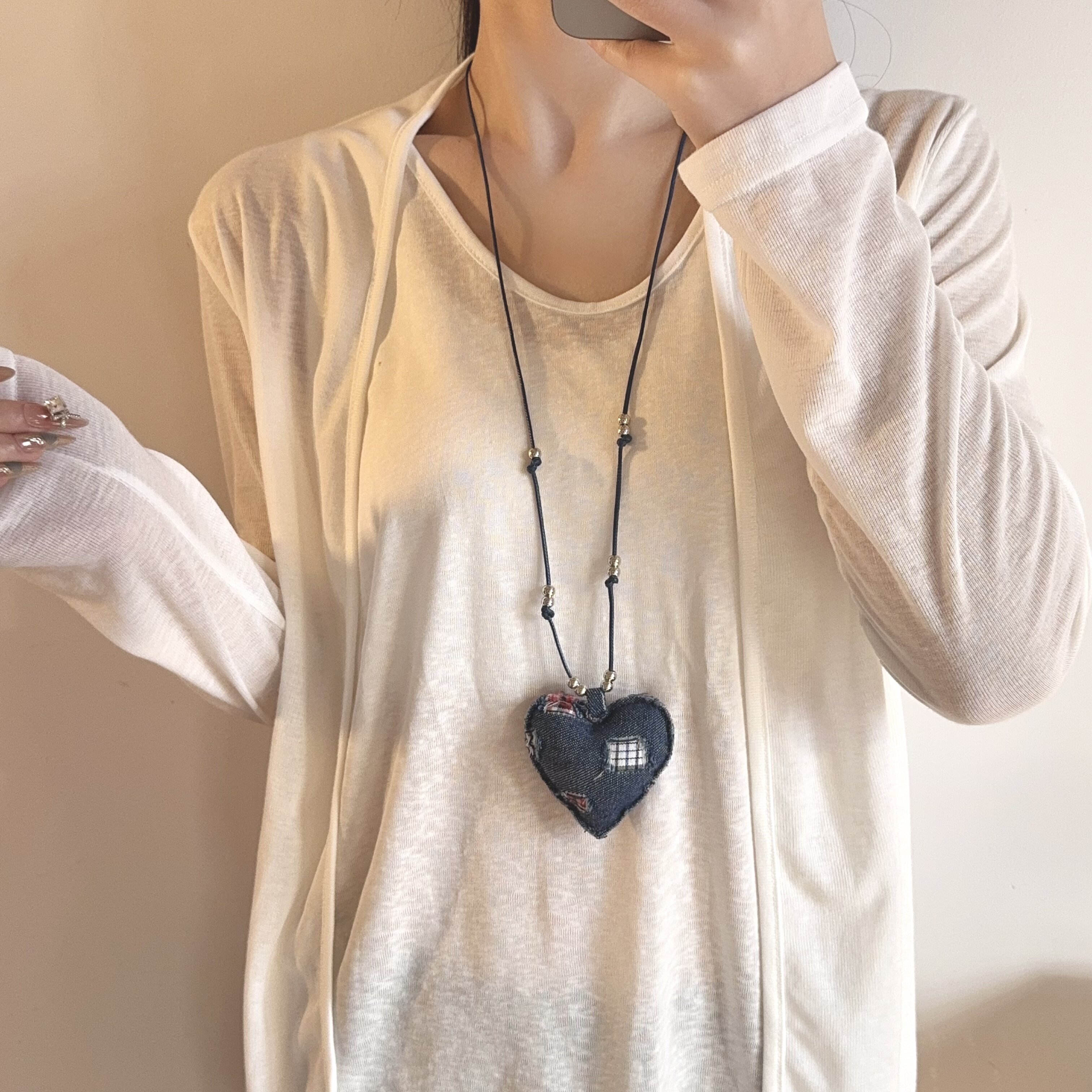 蓝色牛仔布艺爱心吊坠项链女时尚百搭挂脖长款毛衣链轻奢复古配饰