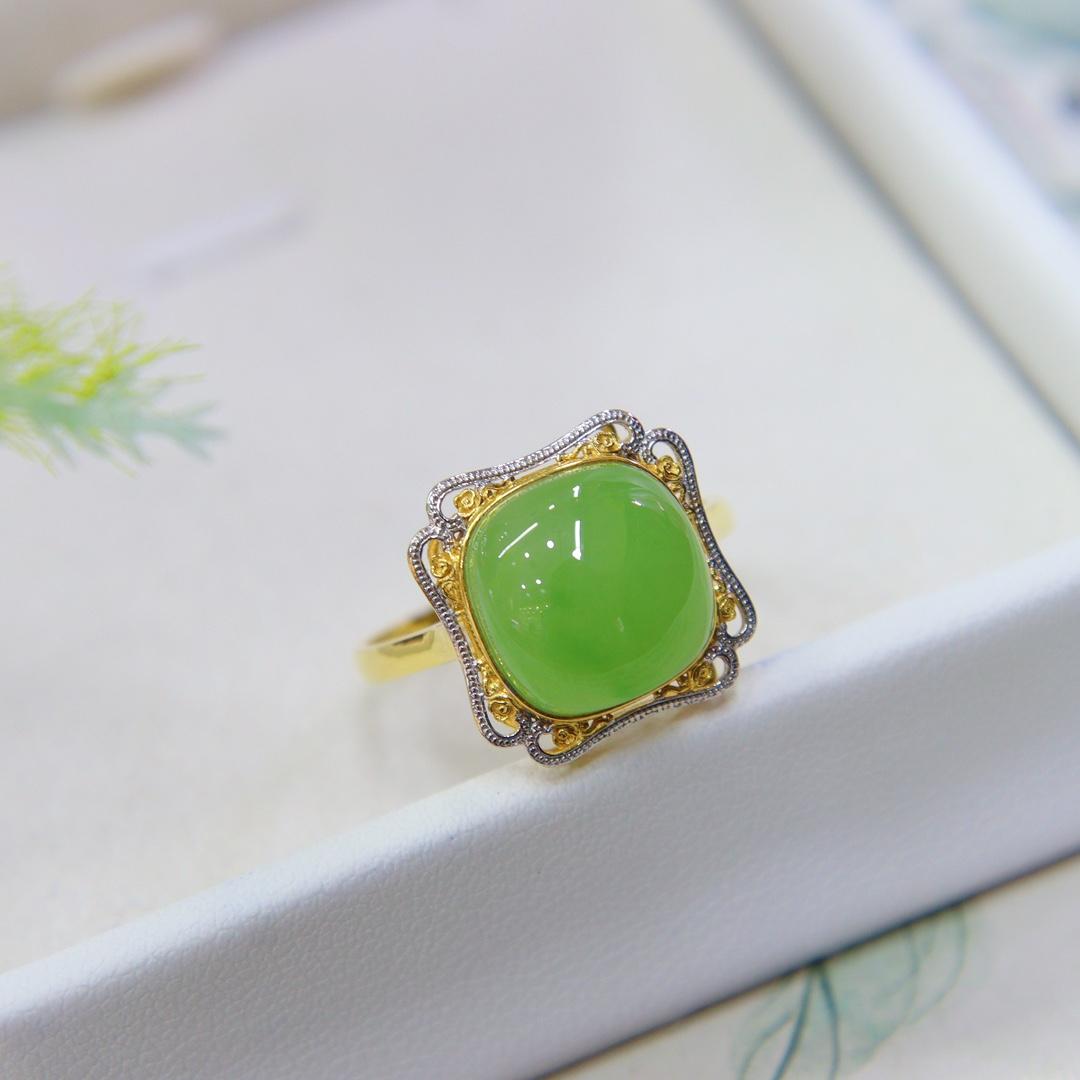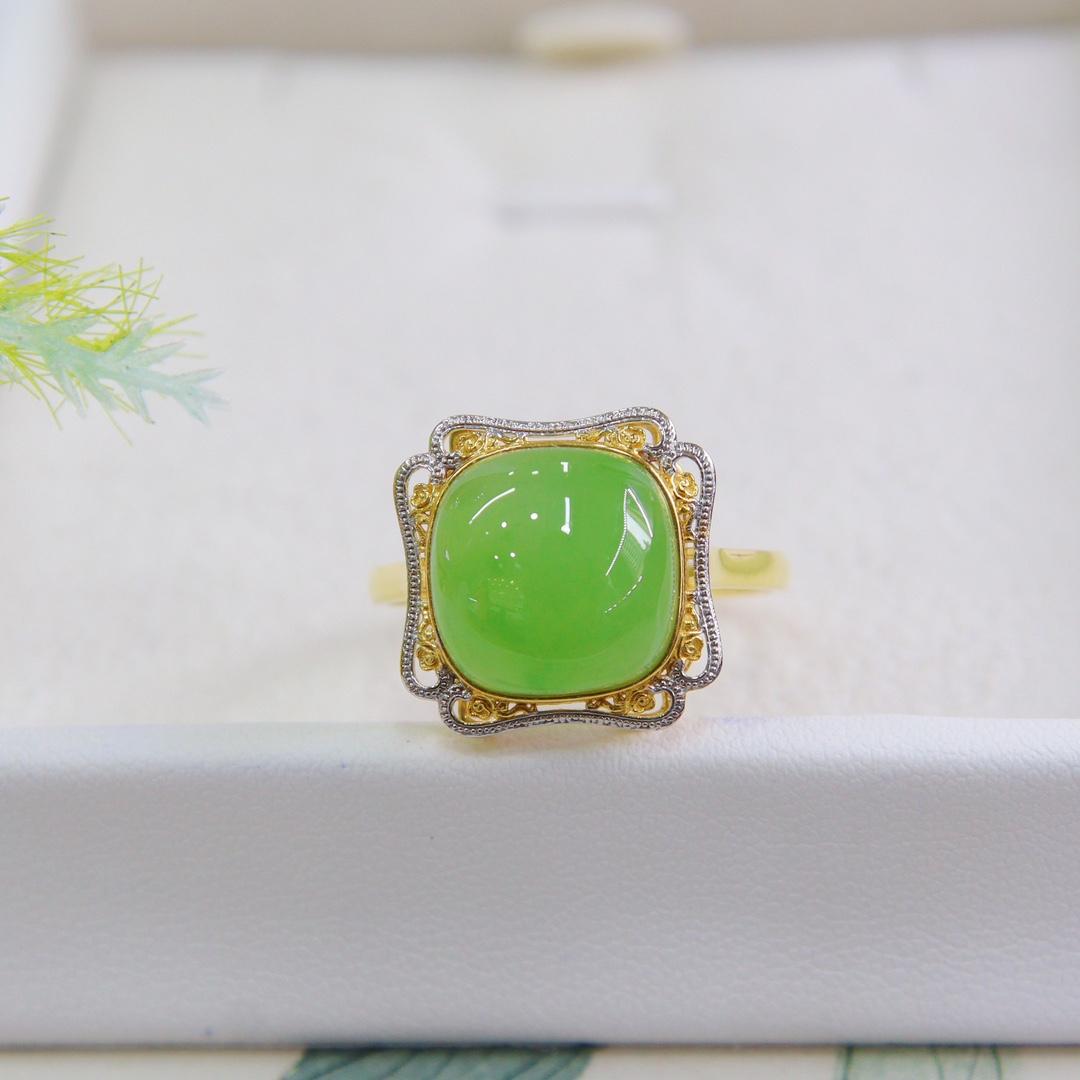 双十二天然和田玉戒指女a货老料苹果绿碧玉方形镶18k金指环送妈妈