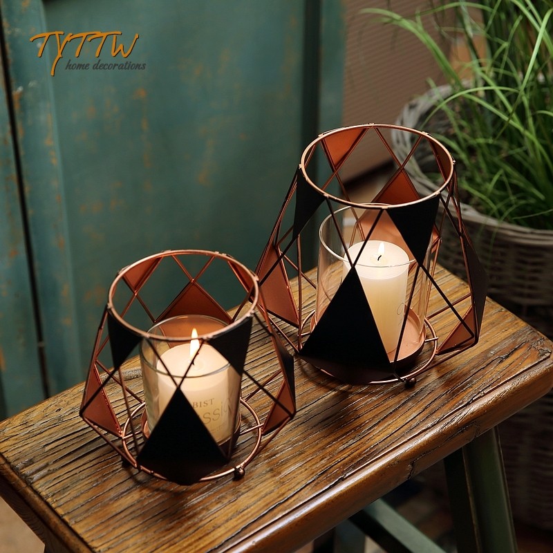 欧式铁艺艺术几何造型装饰烛台 黑色钻石款风灯工艺 经典烛台摆件
