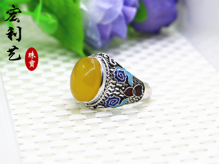 宏利925纯银戒指空托镶嵌活口掐丝景泰蓝戒指托琥珀戒托银托11*14