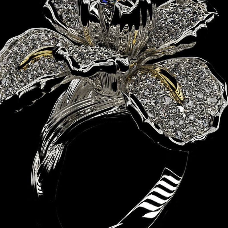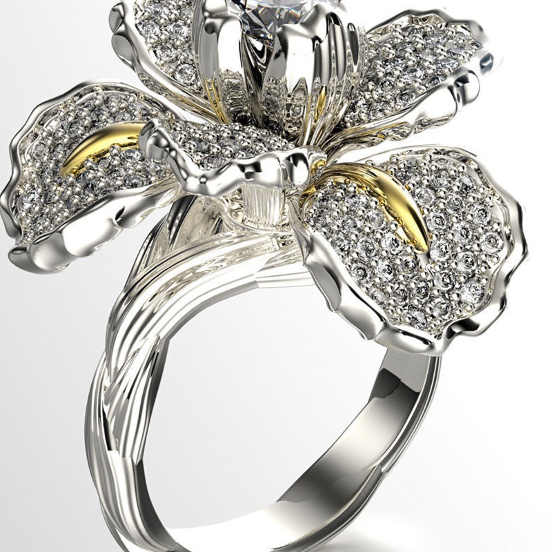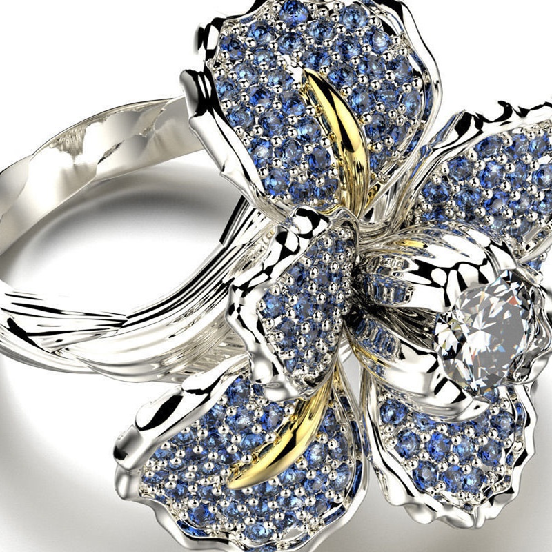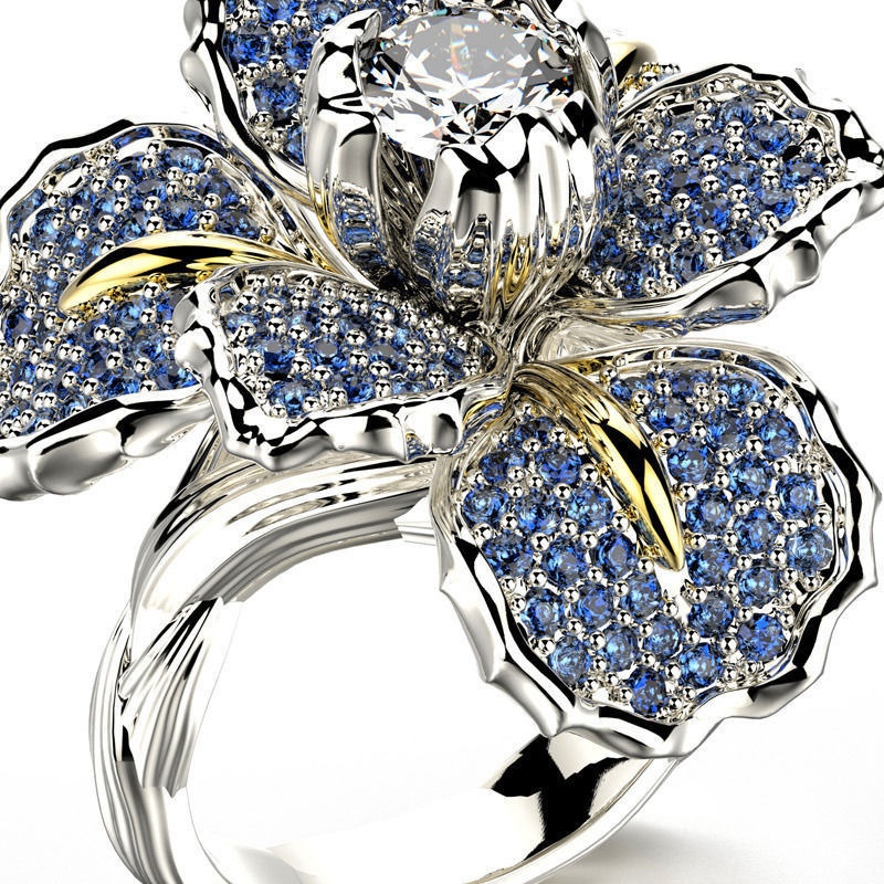 臻荣微镶满钻鸢尾花双色戒指 欧美蓝色托帕石花朵订婚鸡尾酒指环
