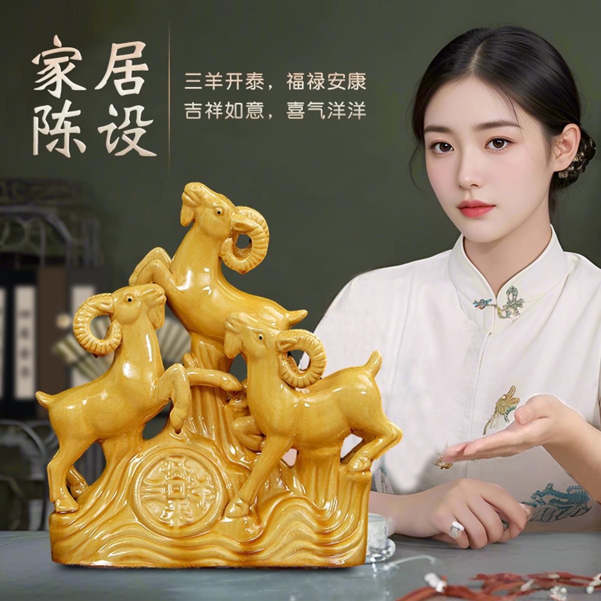 三羊开 泰黄色陶瓷羊客厅摆件十二生肖羊家居西南补角吉祥物工艺