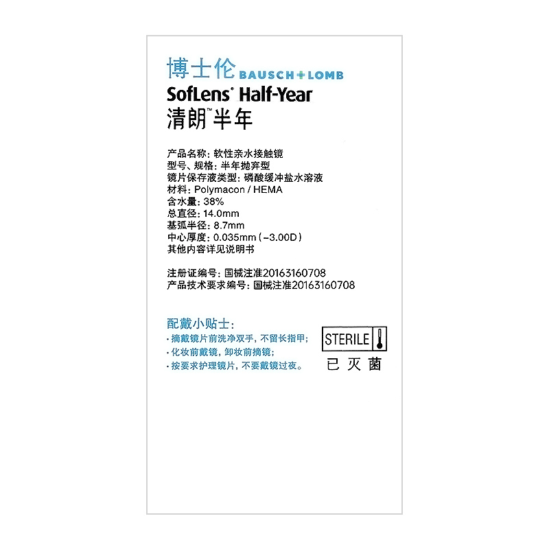 博士伦隐形近视眼镜清朗半年抛盒2片装舒适6月抛透明片旗舰店正品