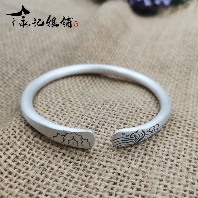 足银999手镯女哑光实心山海图文艺民族风纯银手工古法手环定制
