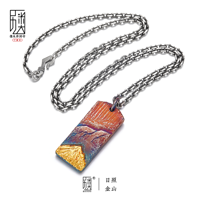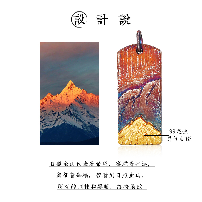 原创设计【日照金山】吊坠男士时尚复古潮999纯银镶24K金手工项链