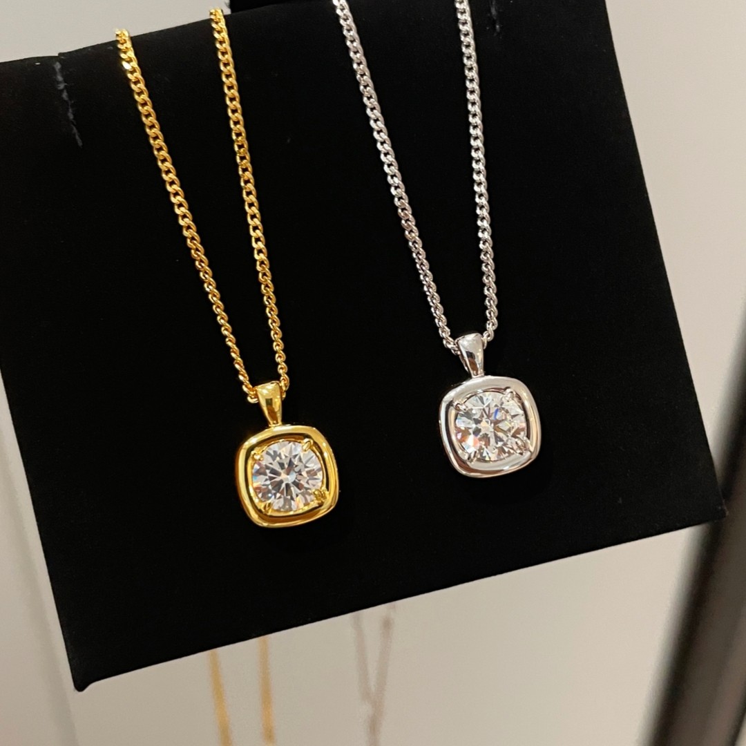 肥嘟嘟吐司|正方形简约光金1克拉仿真钻石项链女925纯银镀18K金色
