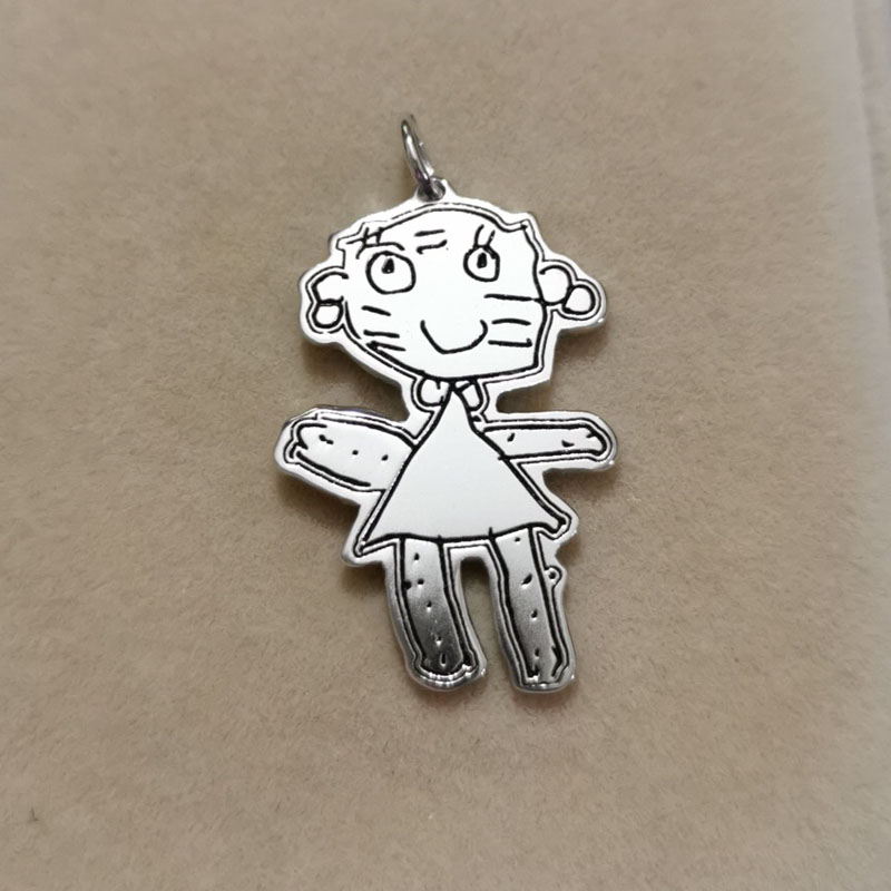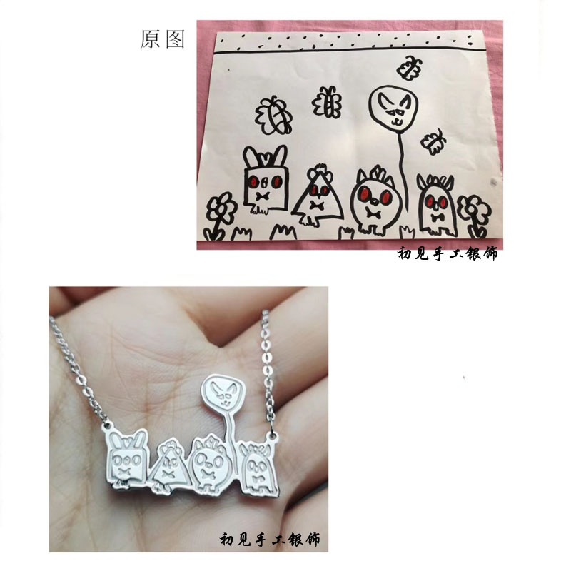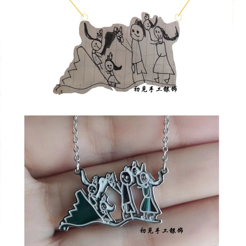 DIY定做925银儿童涂鸦手绘艺术刻字自画男女情侣来图定制创意项链