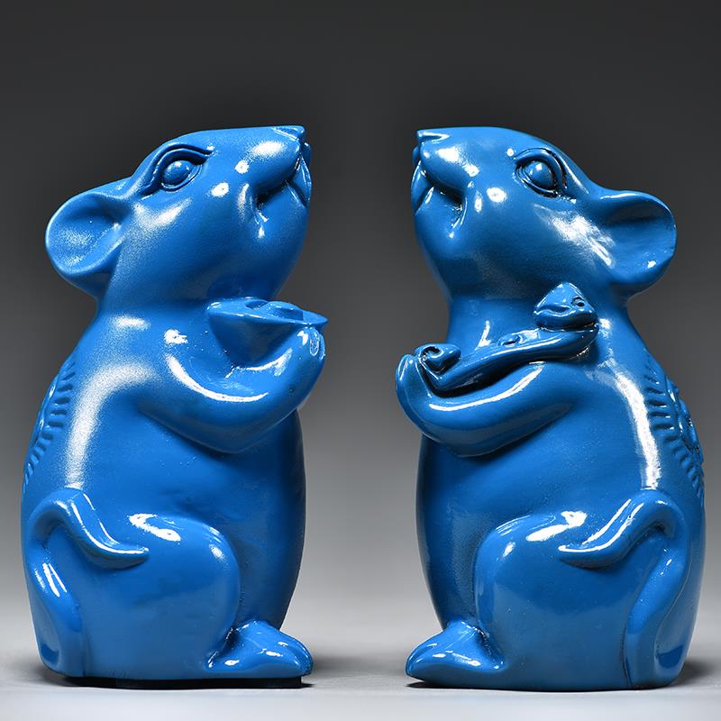 蓝色实木质老鼠摆件木头雕刻十二生肖鼠吉祥物房屋补角木制装饰品