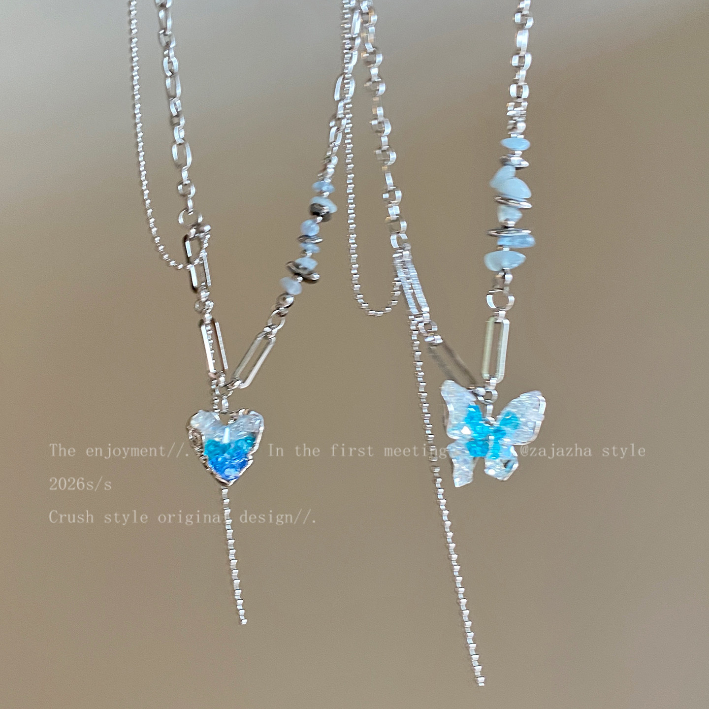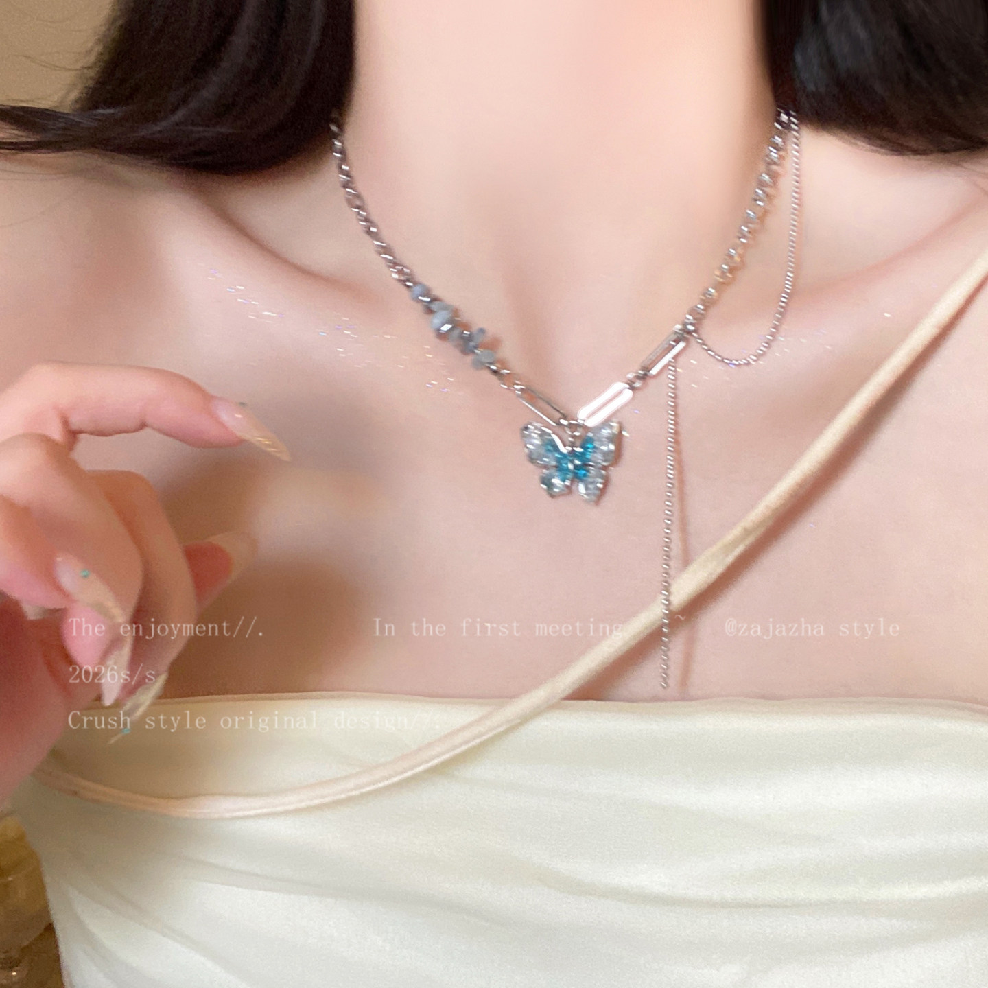 梦境之翼~蓝色蝴蝶结项链女款春夏高级感锁骨链2026新款小众配饰