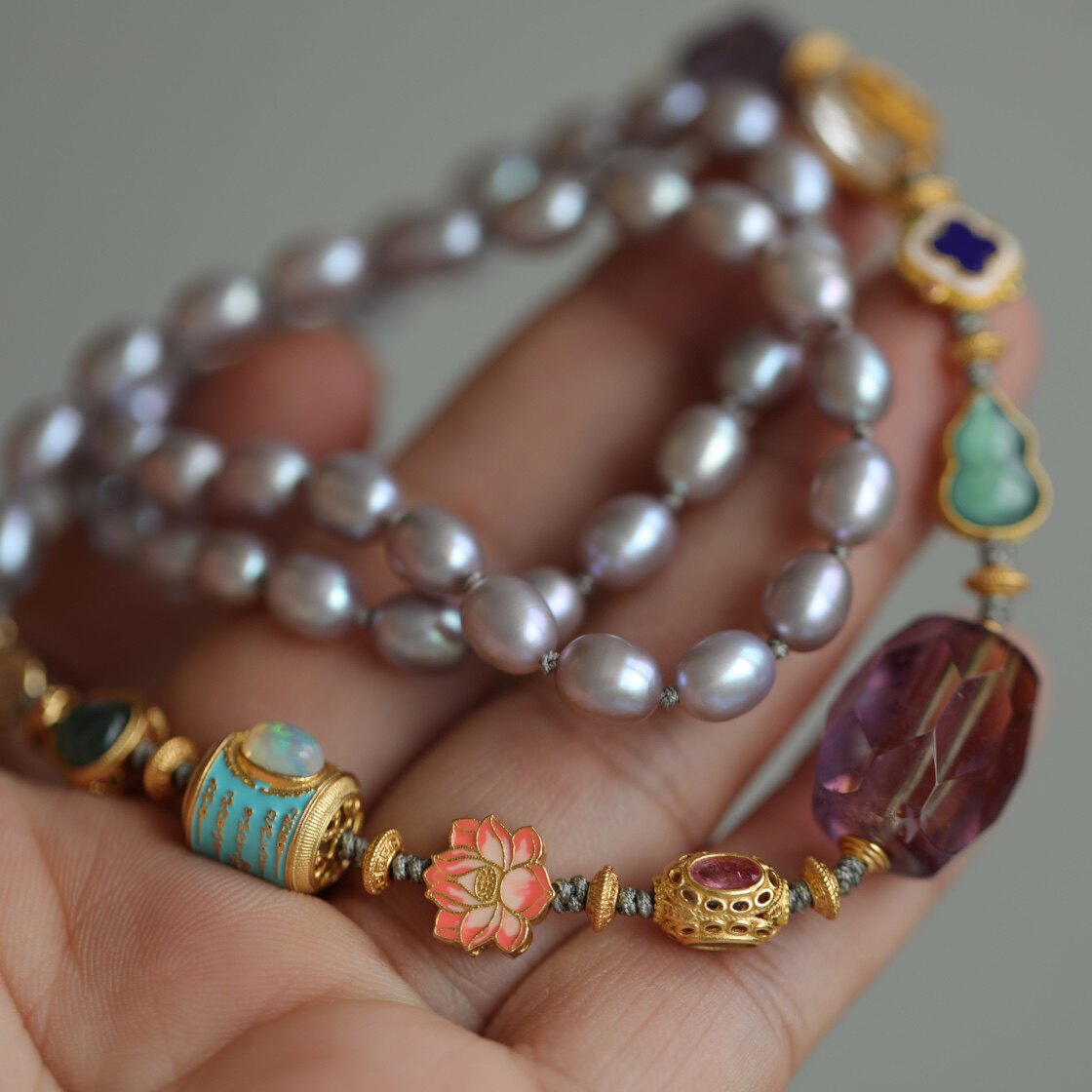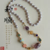 高端定制天然淡水珍珠项链超美的粉紫色搭配天然紫黄水晶磨面桶珠