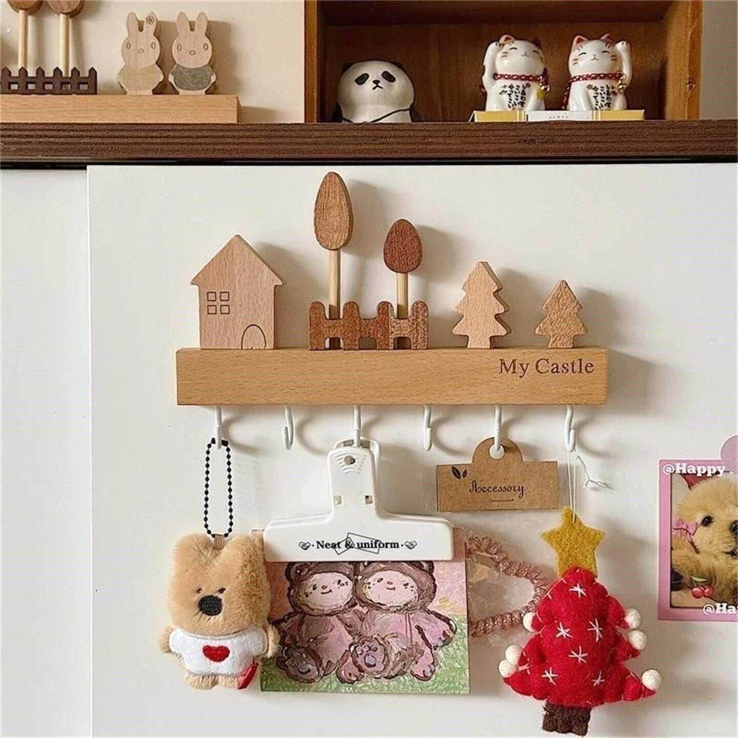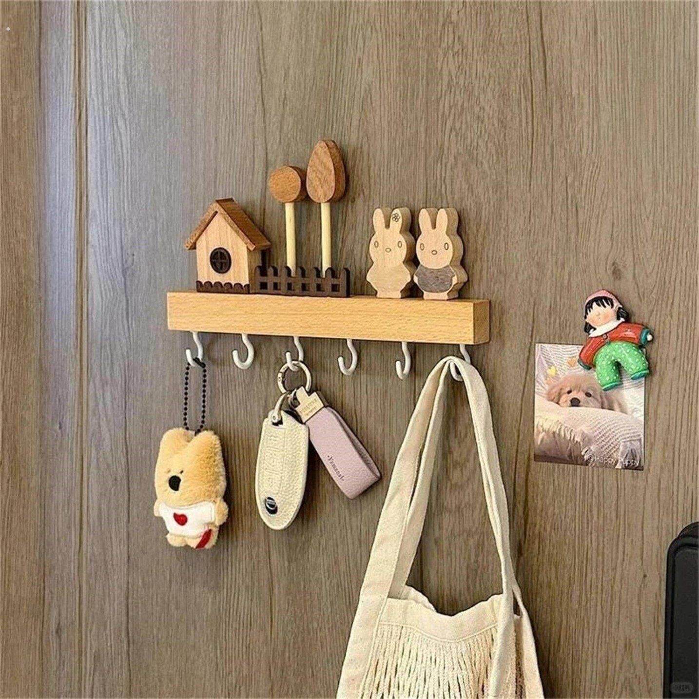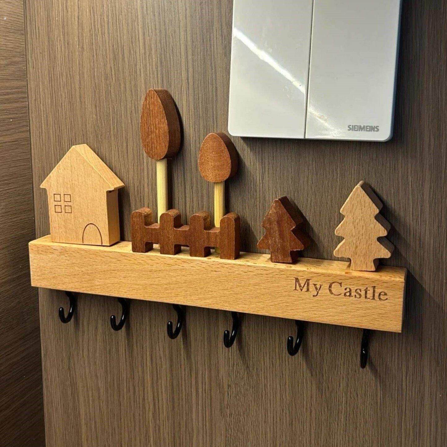 钥匙收纳玄关摆件壁挂式免打孔收纳架榉木挂钩中古风门口墙上装饰