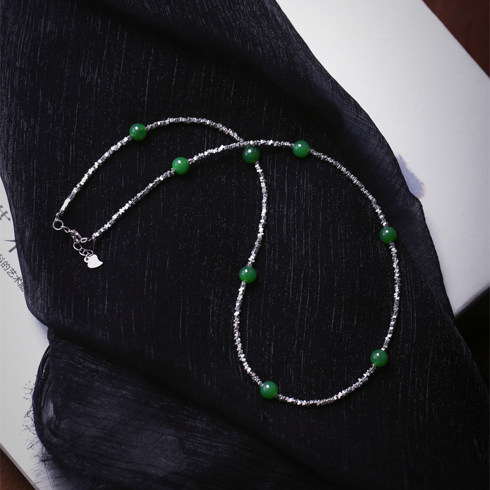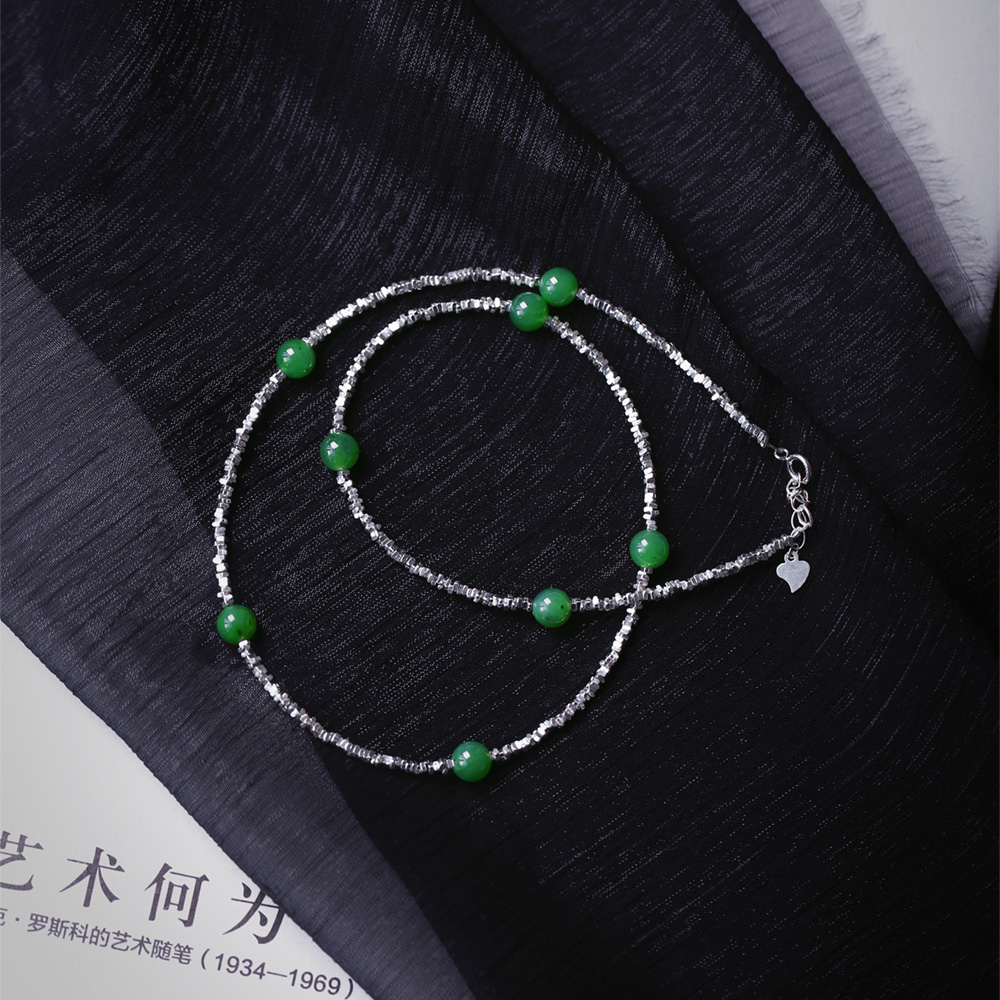 天然俄罗斯碧玉圆珠搭配925碎银款项链 手链 女款纯银饰品
