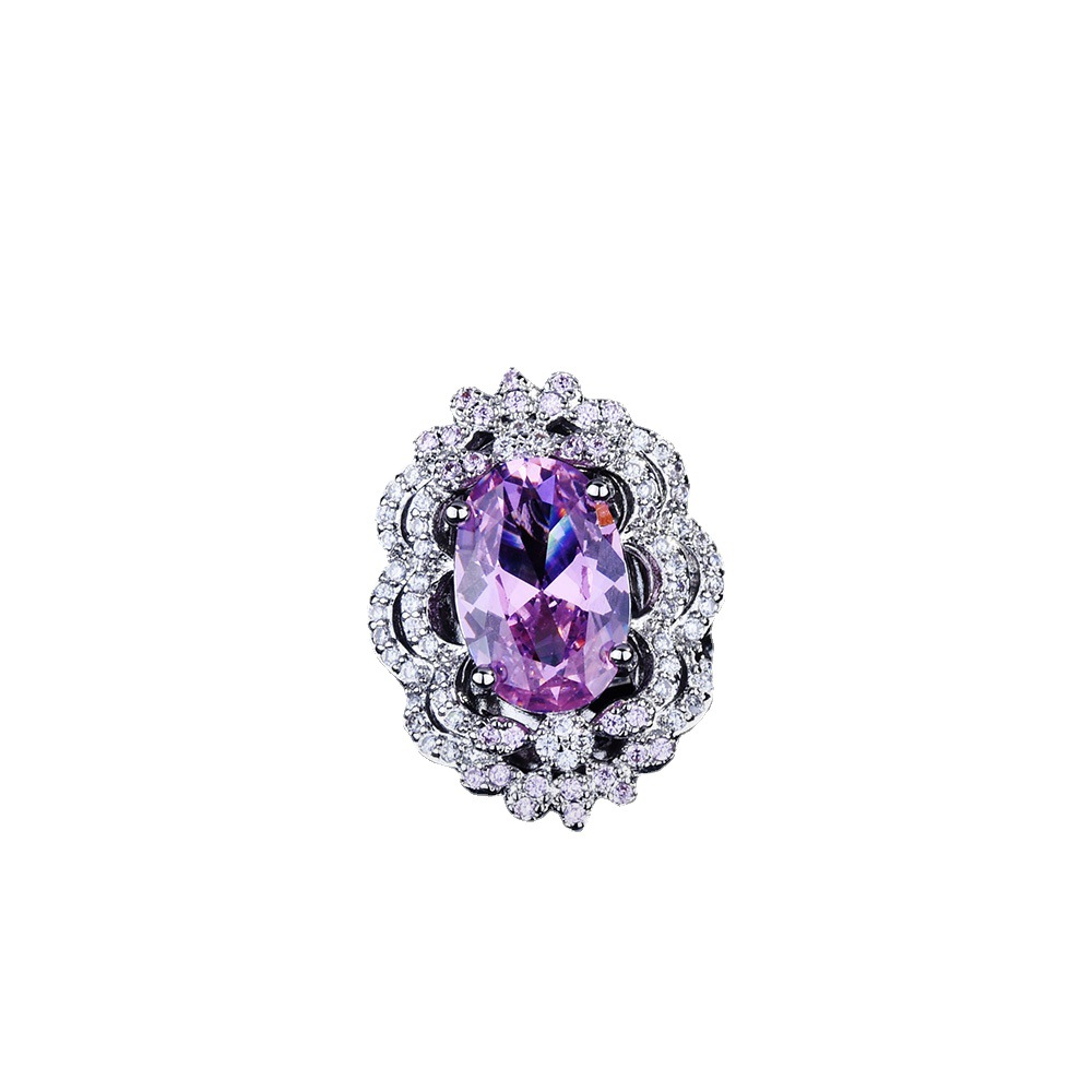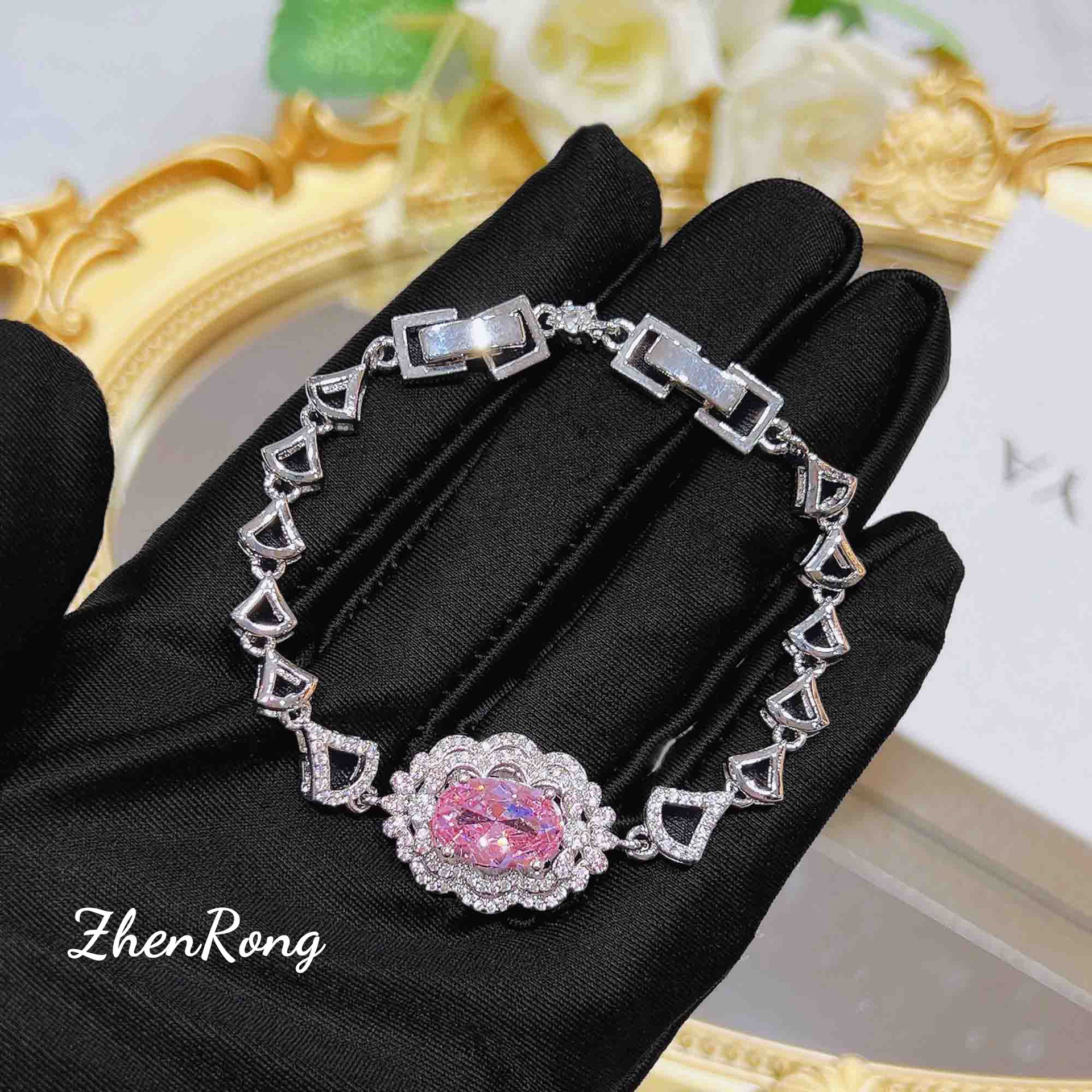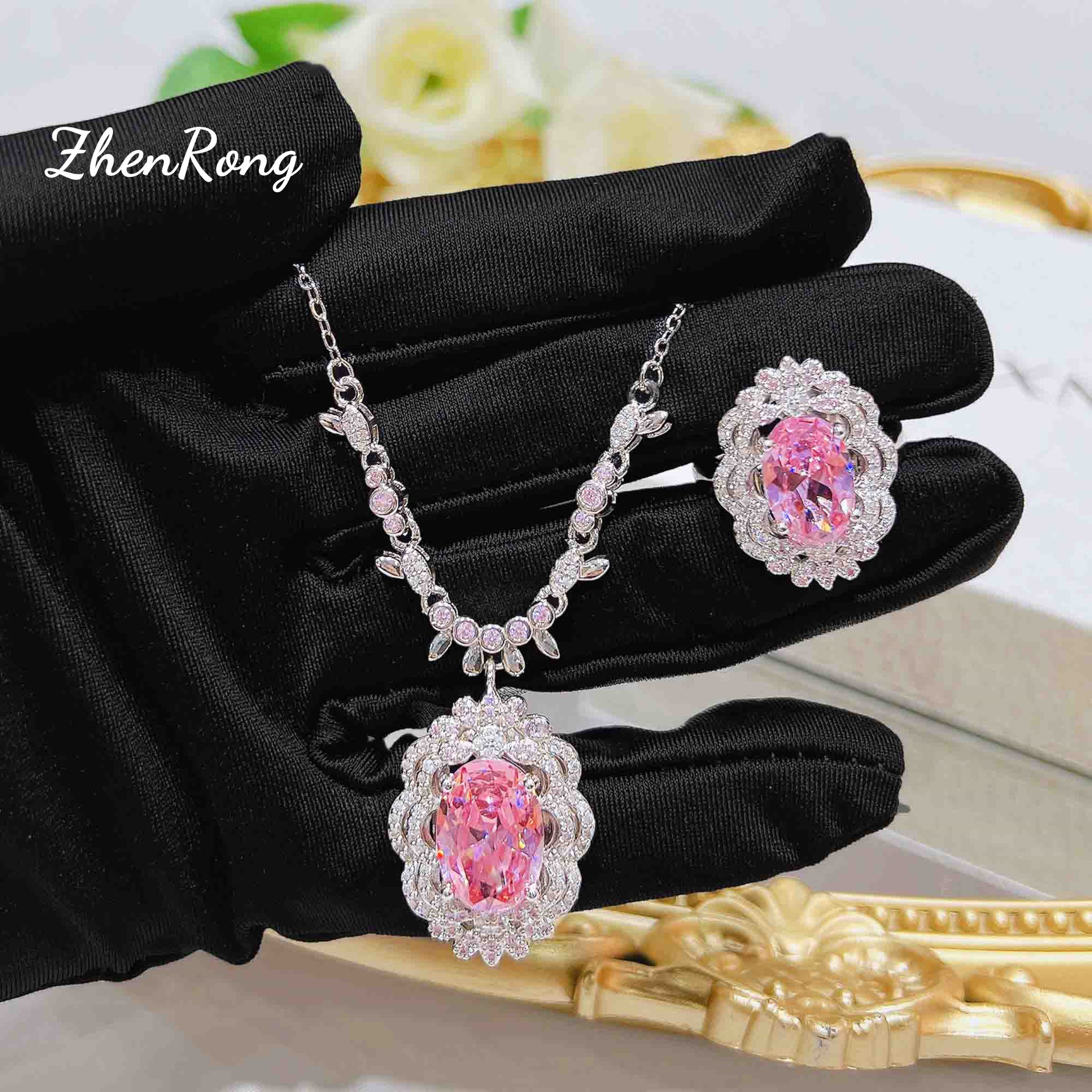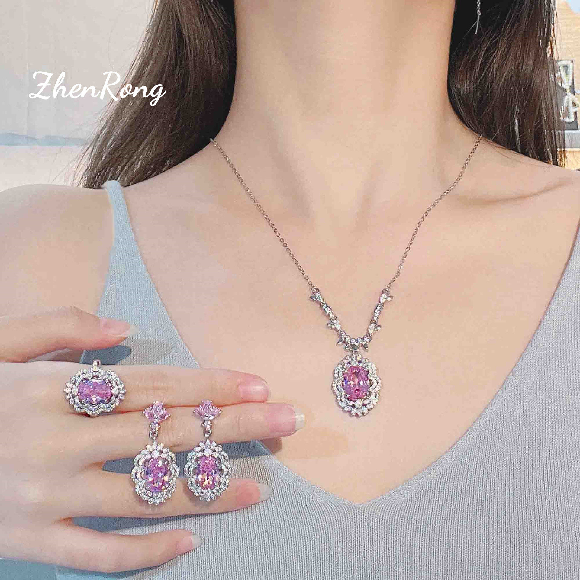 Young网红甜美粉钻项链奢华樱花粉吊坠套装开口戒指满钻彩宝手链