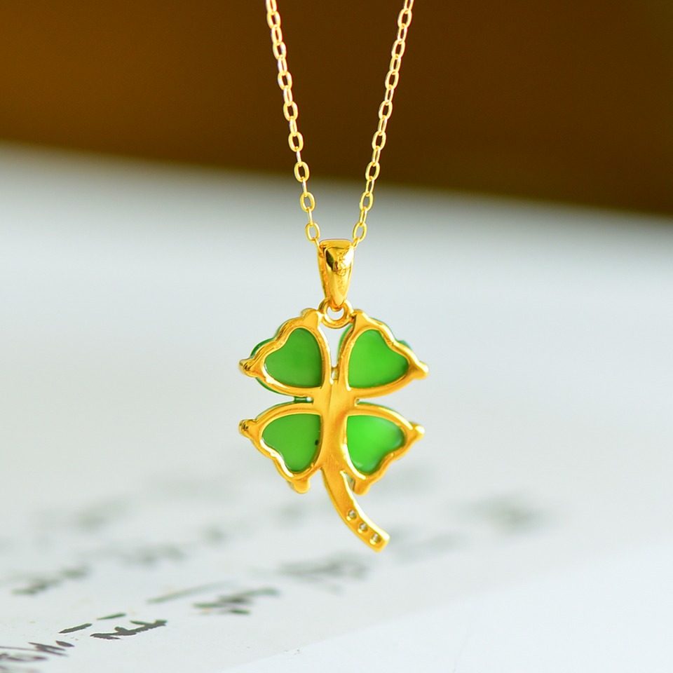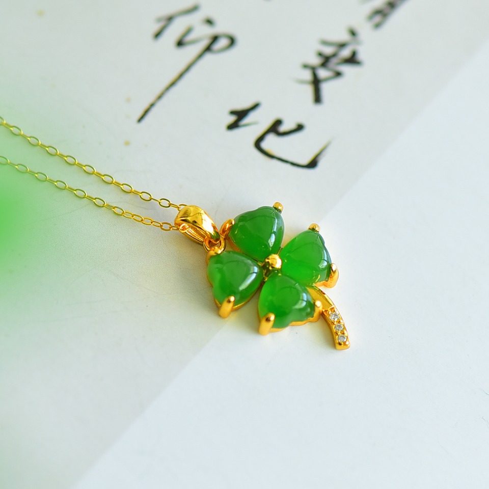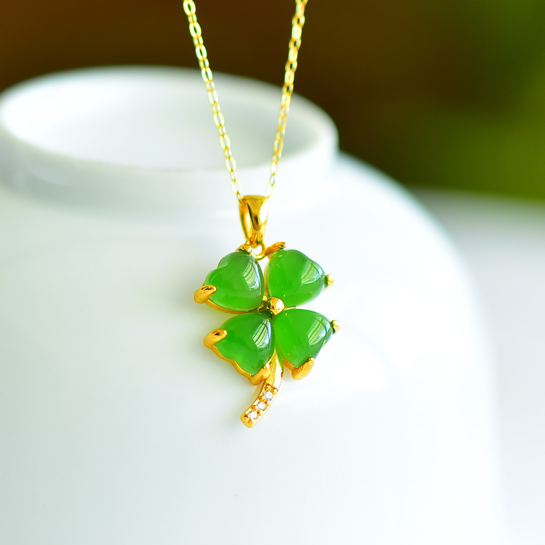 S925银和田玉碧玉心形四叶草玉石吊坠挂件时尚气质女玉坠项链