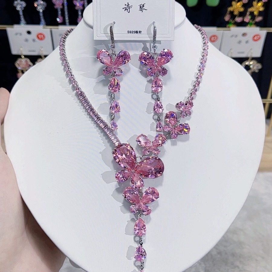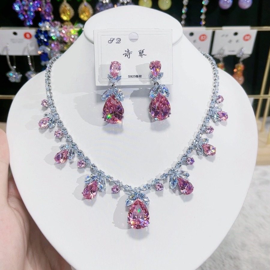 欧美轻奢锆石装饰项链耳环套装粉色郁金香锁骨链婚纱礼服配饰