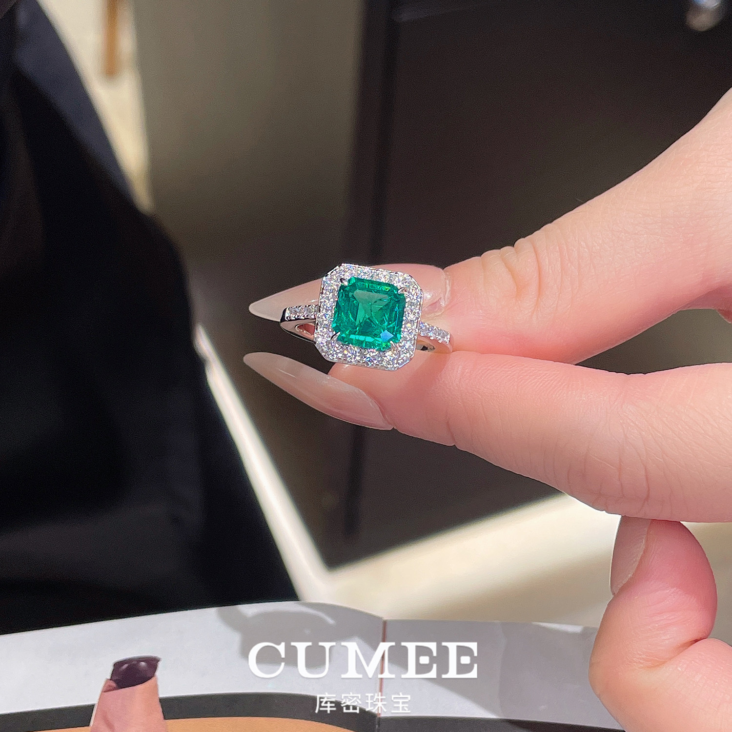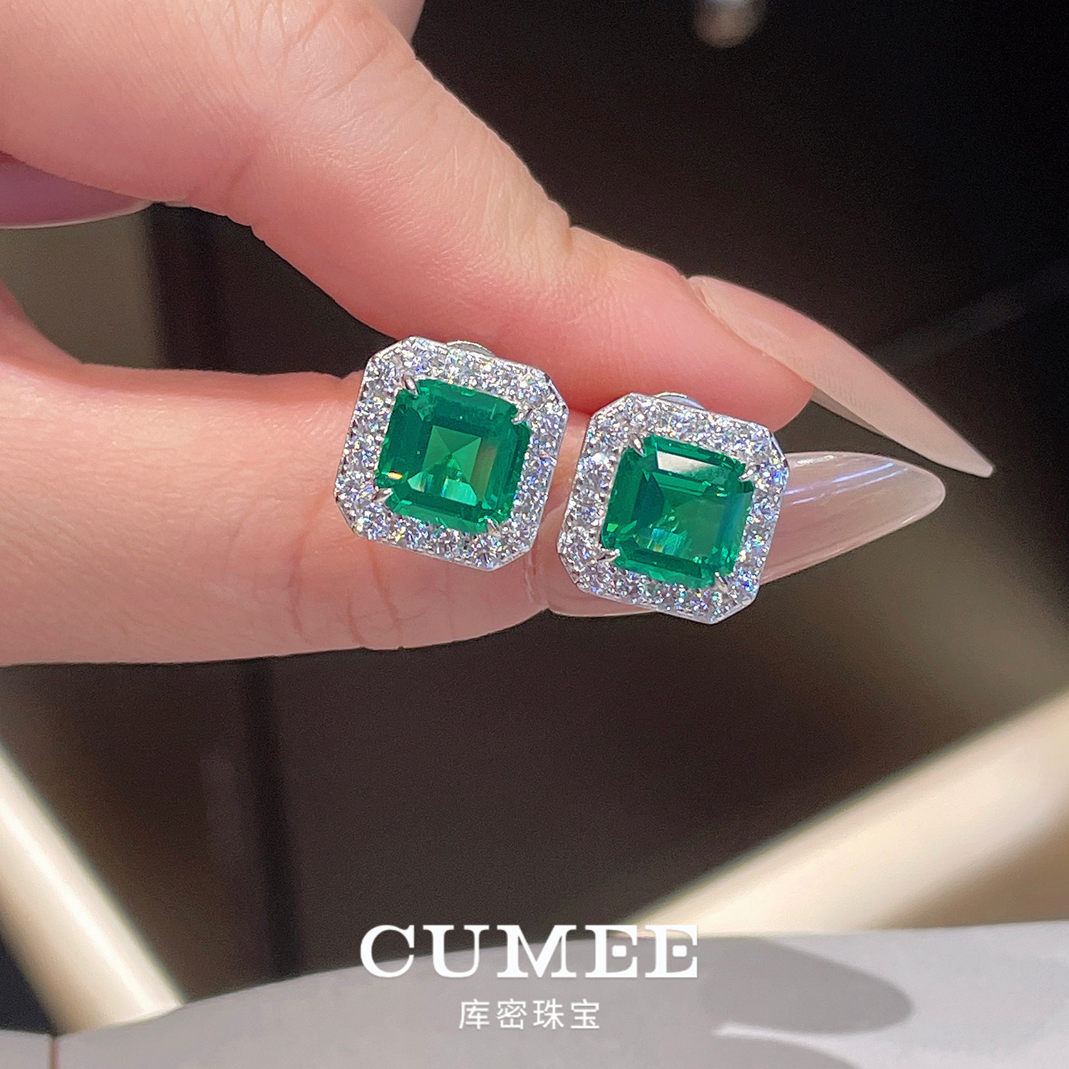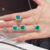 CUMEE 精致通勤套装 经典小克拉方形合成仿真祖母绿套装.银镀金