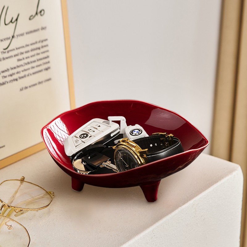 高级感红色陶瓷收纳盘桌面装饰摆件大容量创意托特包造型家居
