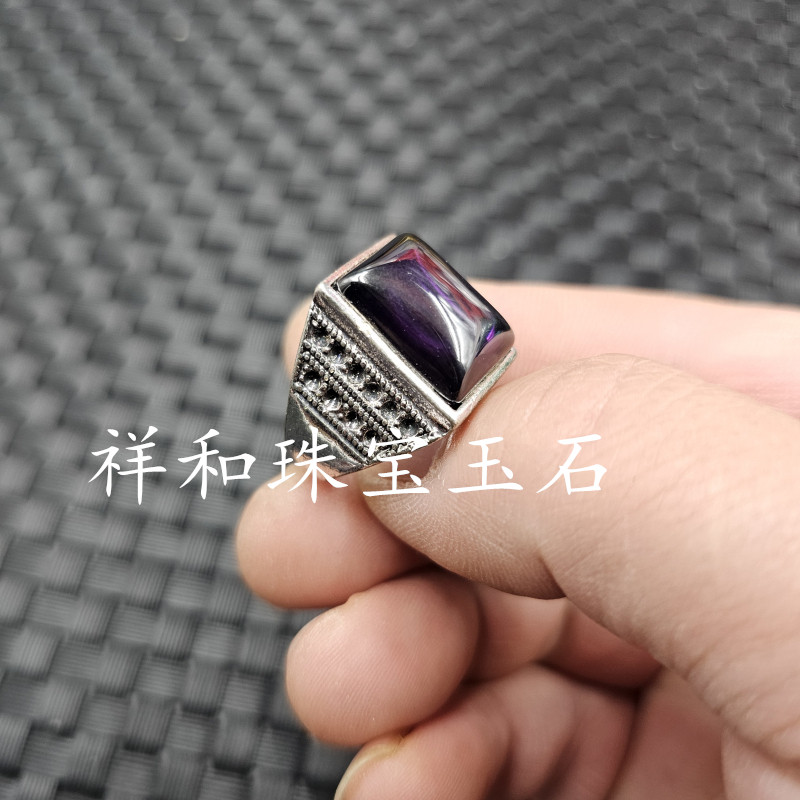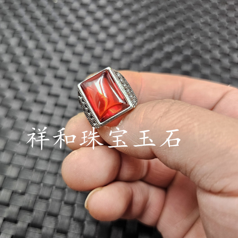 冰种红锆石方形玉石戒指宝蓝色锆石无事牌戒指男女同款户口戒指