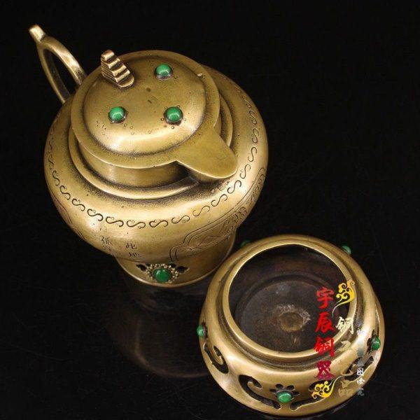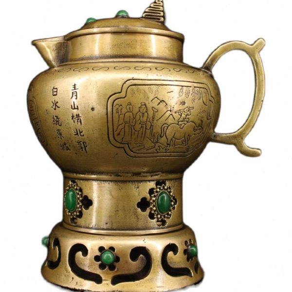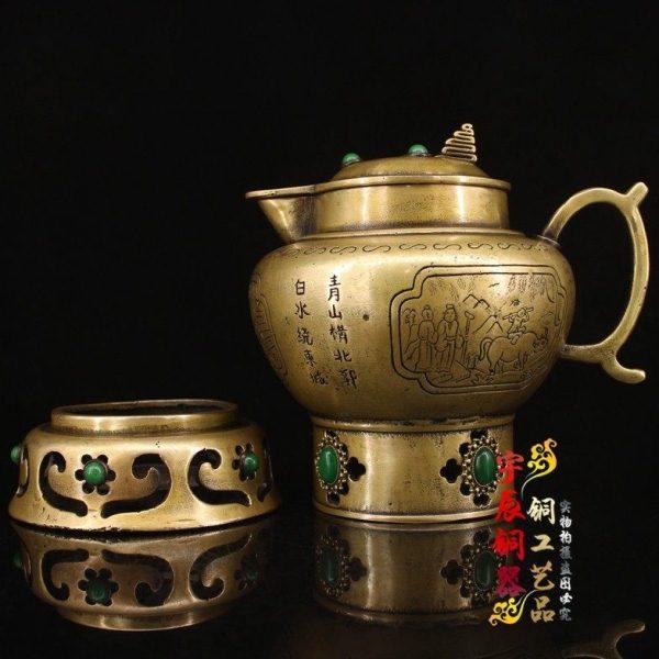 古玩收藏纯铜錾刻镶嵌宝石茶壶炭火炉烧水壶黄铜水壶烧炭铜茶壶