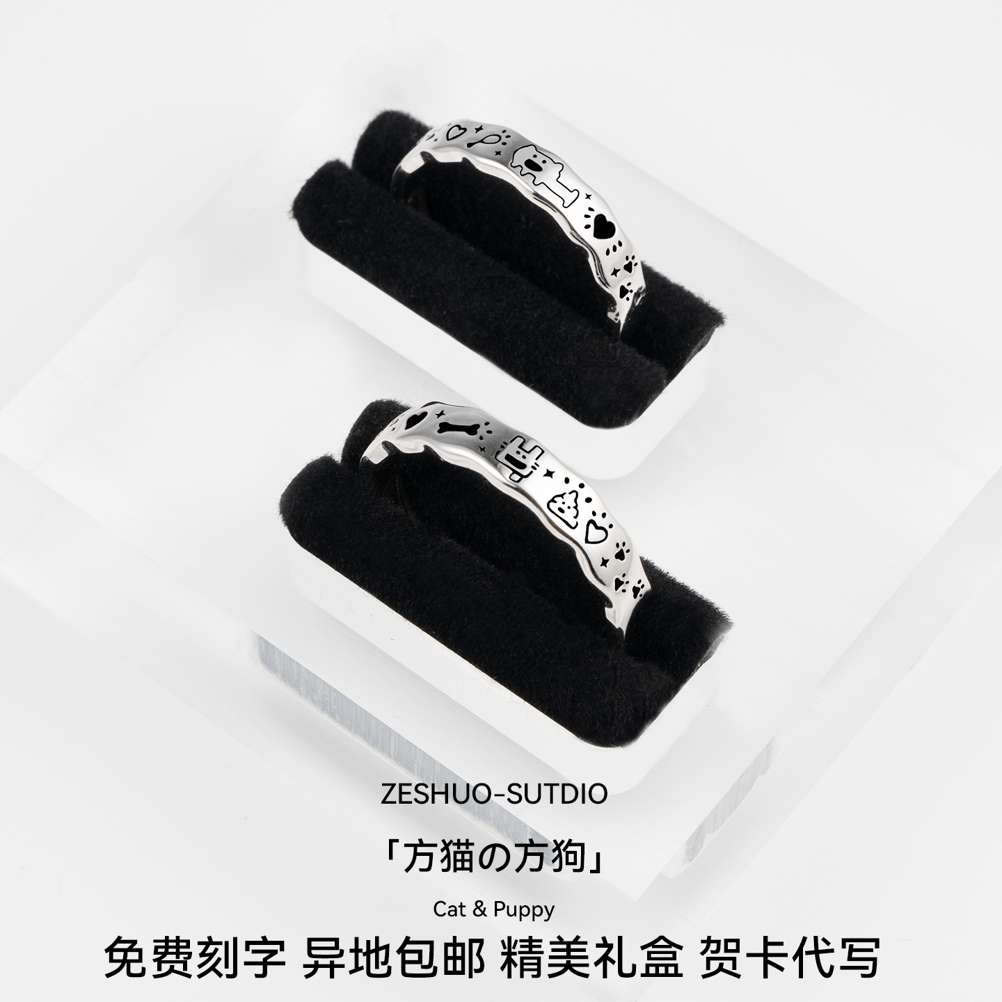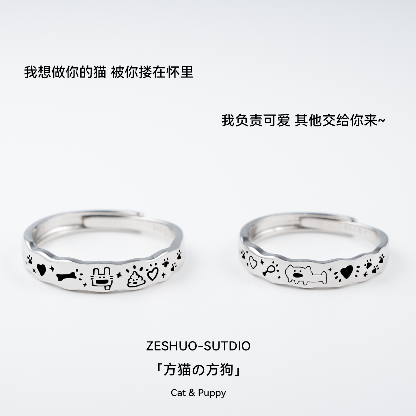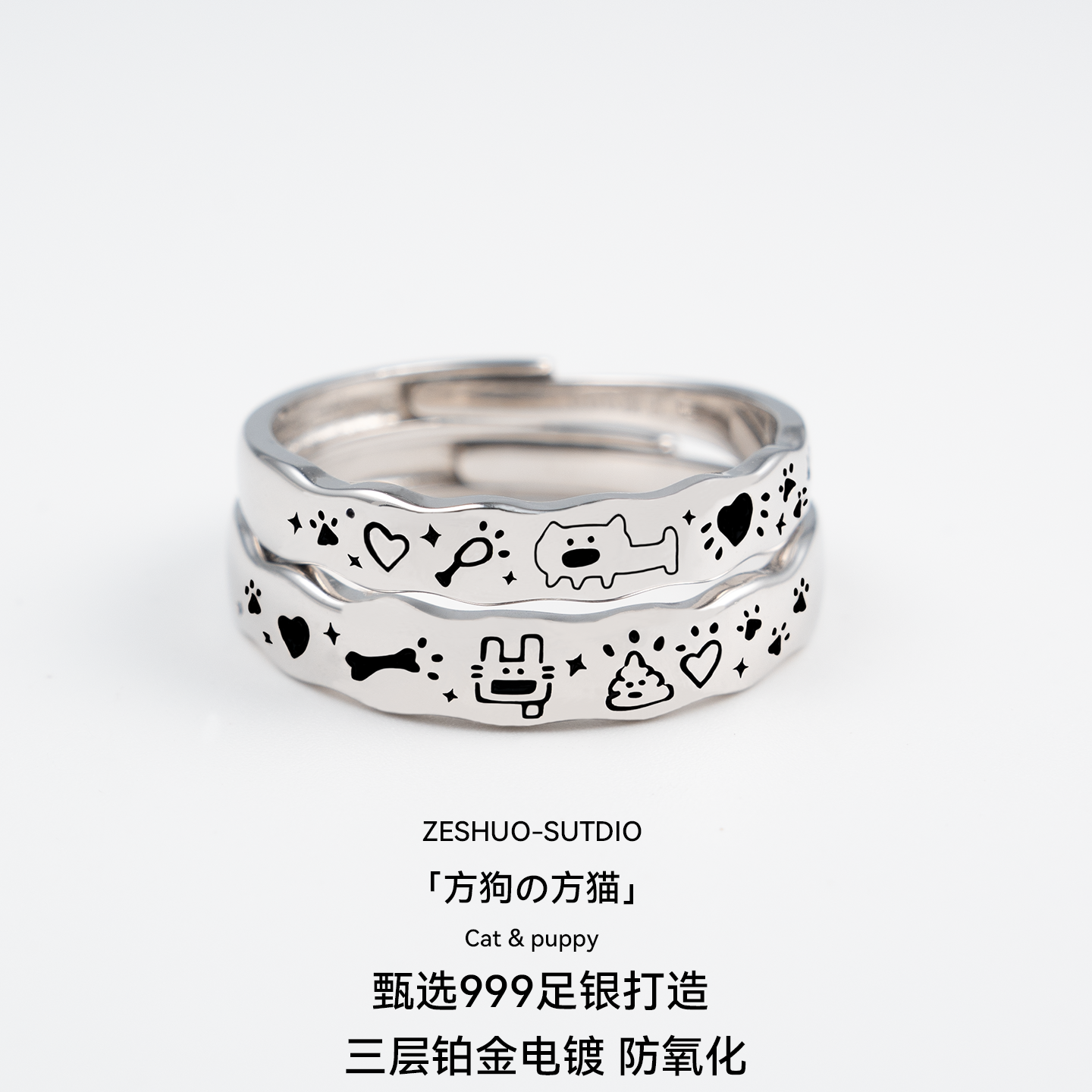 ZESHUO方猫の方狗 独家原创设计情侣对戒999纯银可爱涂鸦足银戒指
