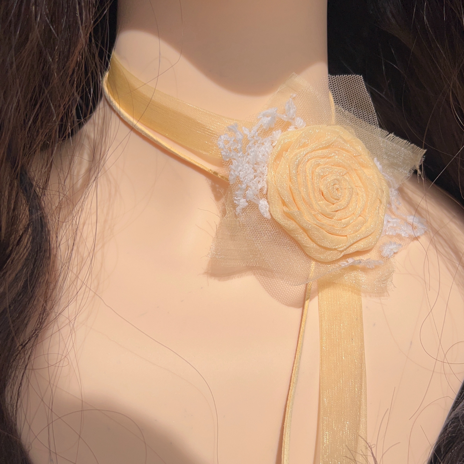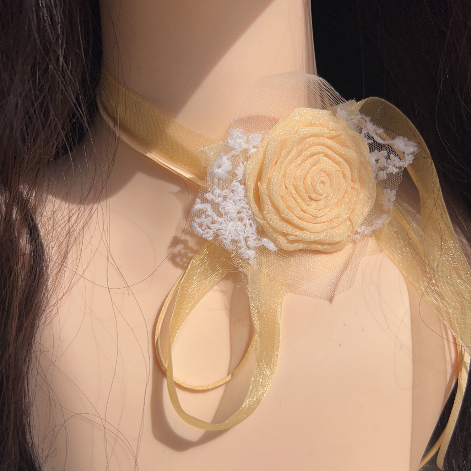 原创设计超仙气甜美少女温柔黄色网纱蕾丝花朵双层项圈颈带项链