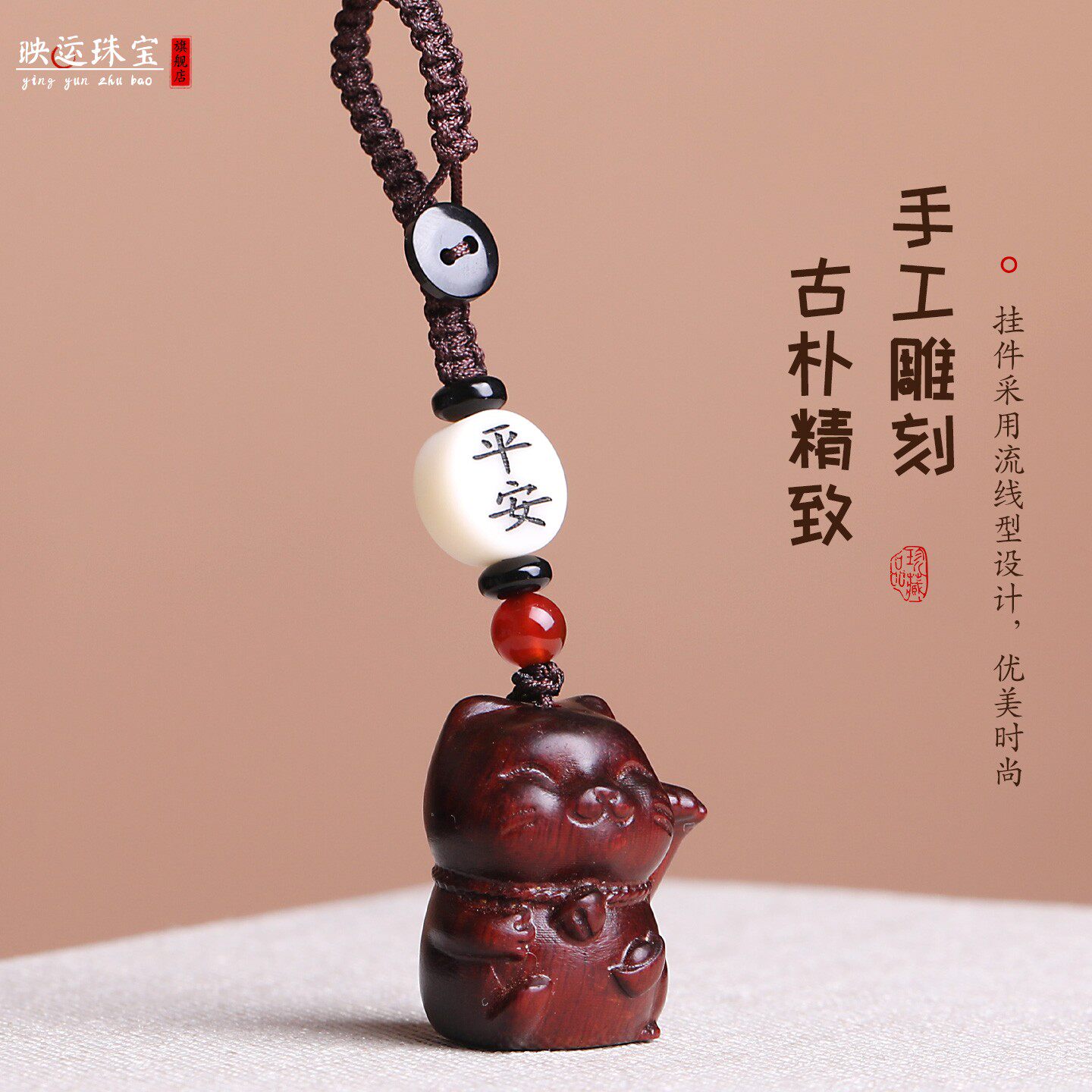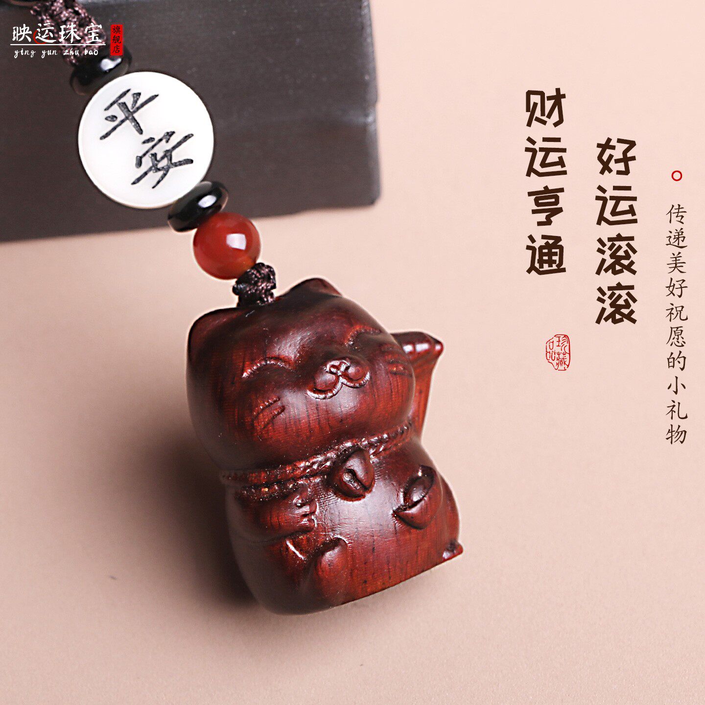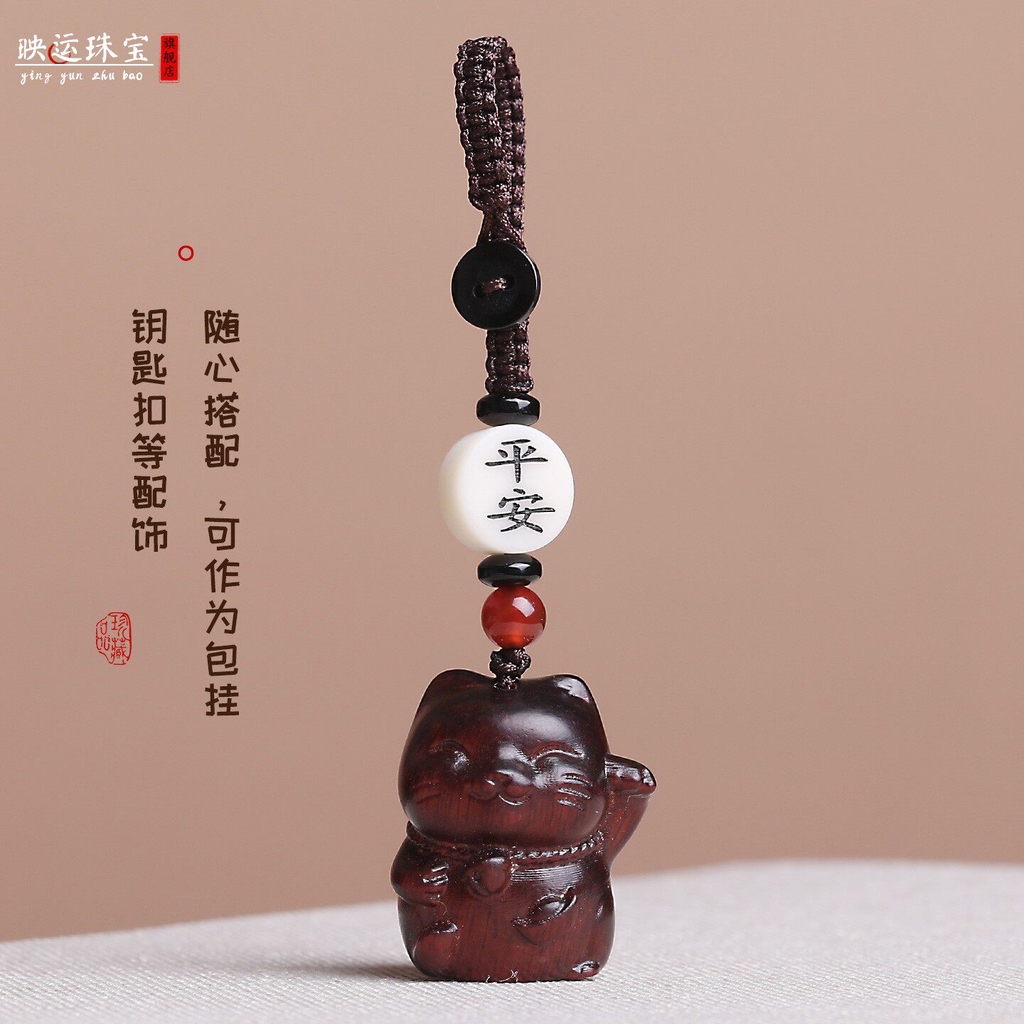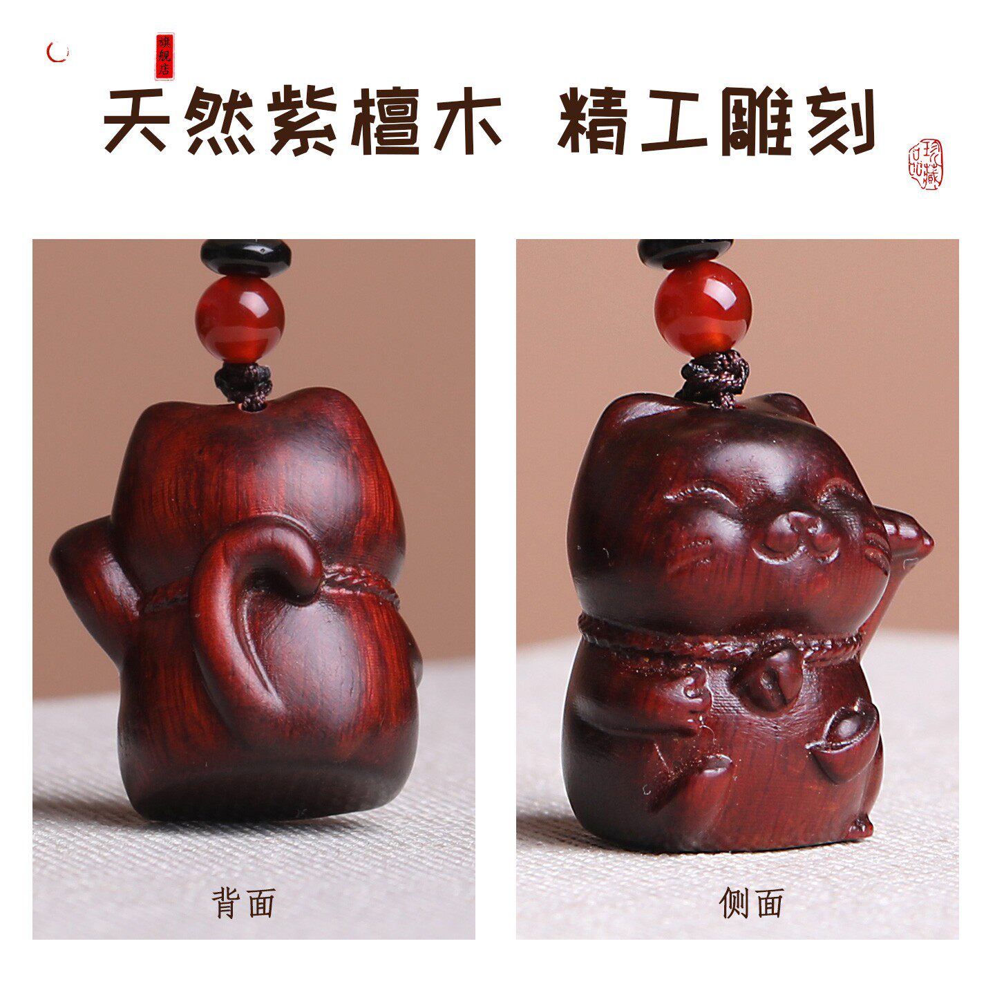 紫檀木招财猫咪汽车钥匙扣挂件可爱小猫创意饰品情侣手机链男女款