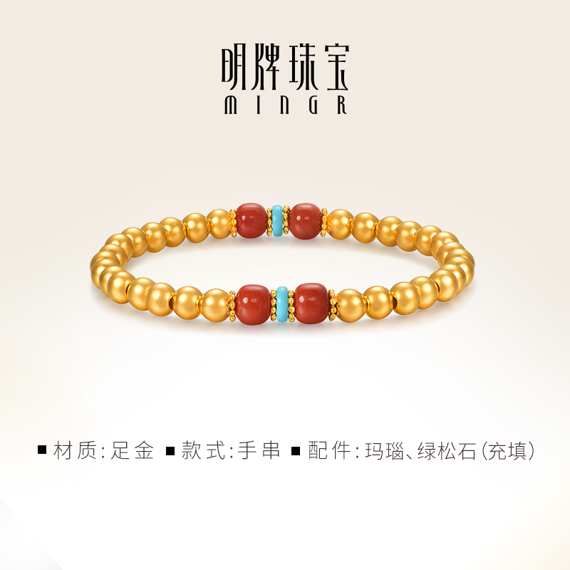 明牌珠宝古法黄金金珠手串 多宝系列足金玛瑙绿松石手链AFK0426