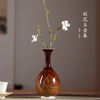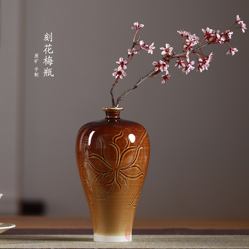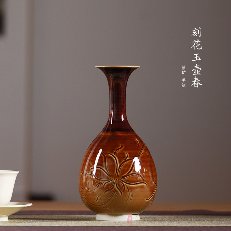 三义成定瓷摆件全手工原矿高温中式刻花黄釉梅瓶玉壶春原产地发货