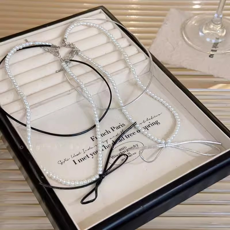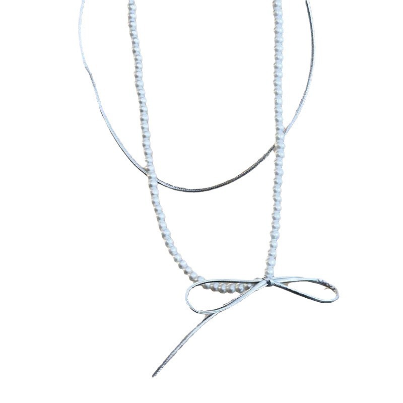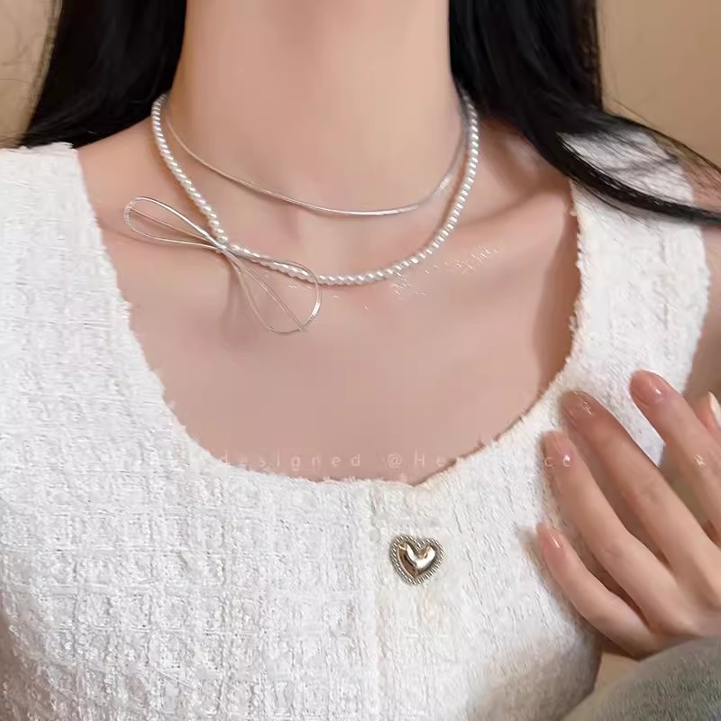 网红蝴蝶结珍珠项链女甜酷风小众设计感颈链双层叠戴独特锁骨链潮