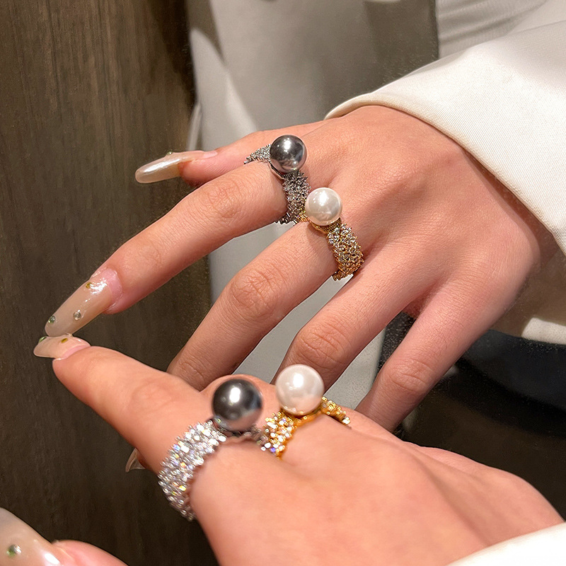 法式满钻极光珍珠真多麻灰澳白色开口戒指女轻奢小众高级感食指环