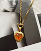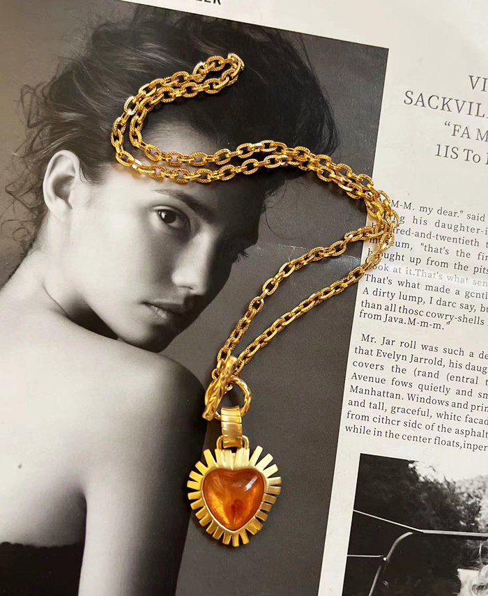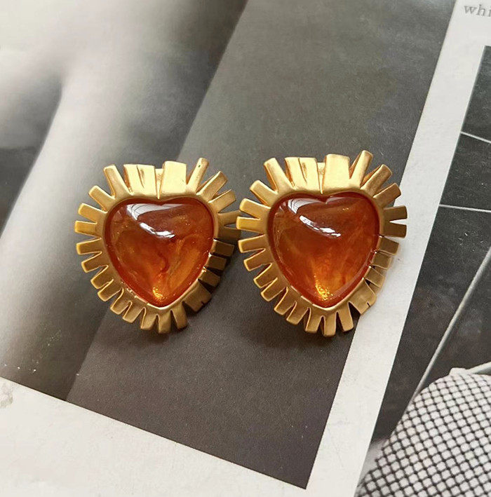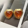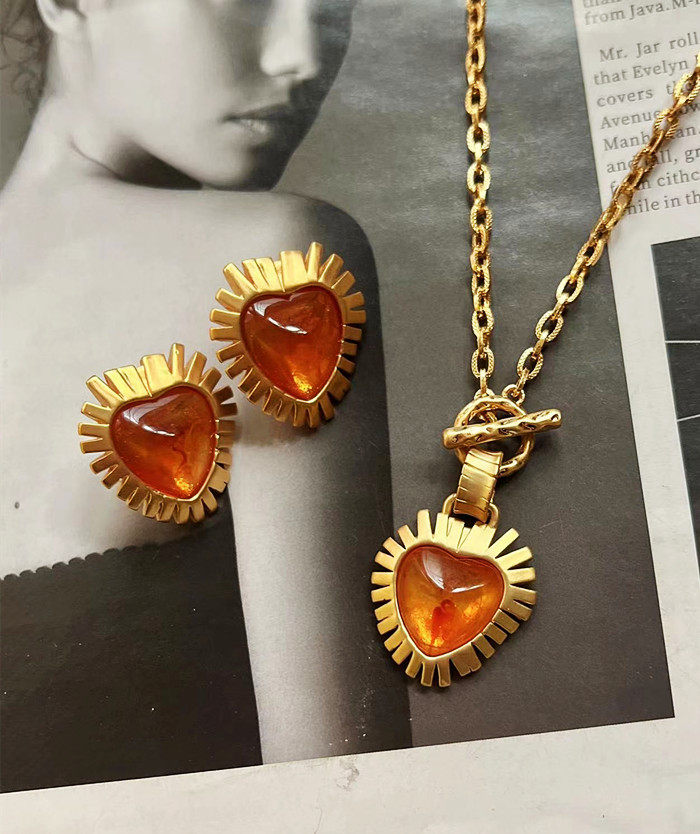 欧美风vintage复古气质橙色爱心树脂镶嵌金属短款项链耳环耳夹女