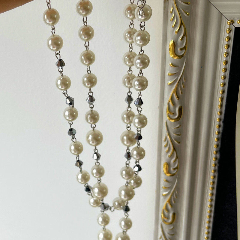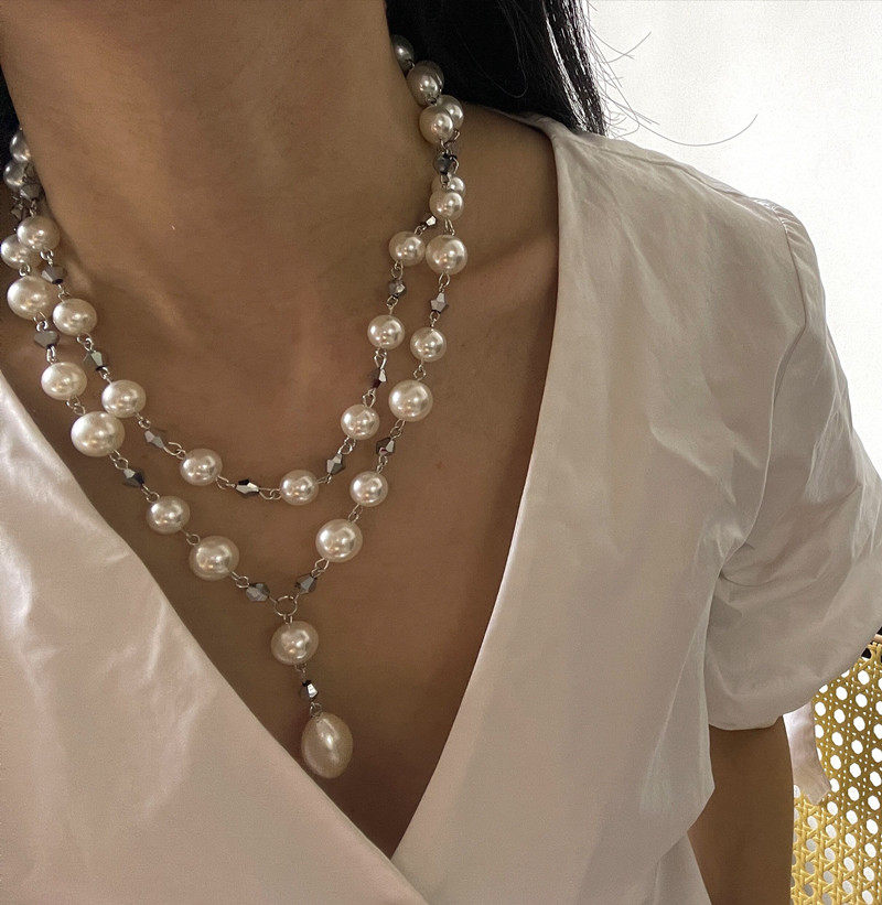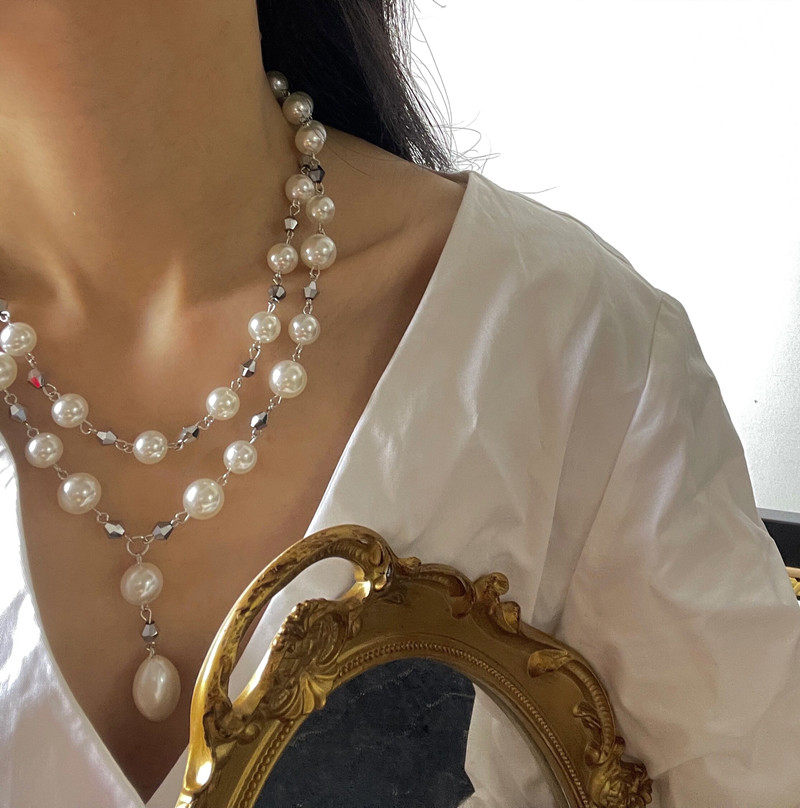 摇儿绕衣领公主风格仿珍珠双层水滴吊坠项链女长款复古拼接毛衣链