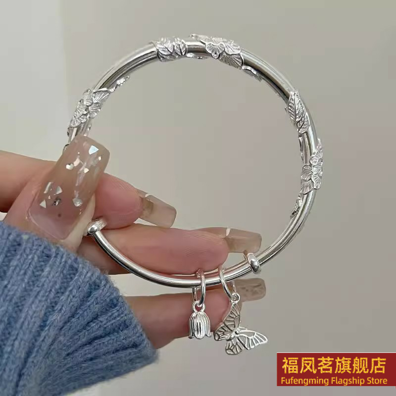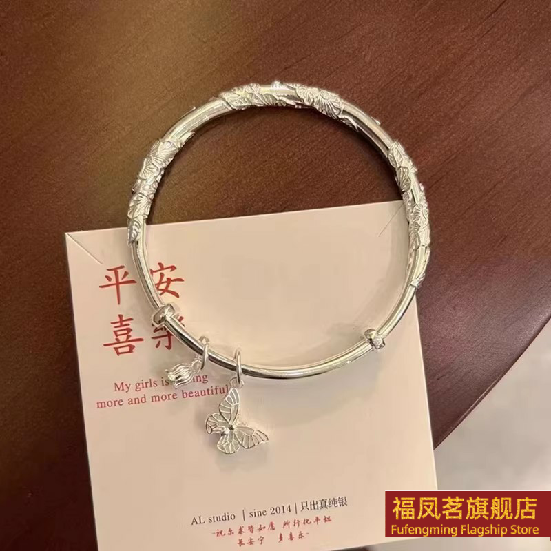 正生新款足银9999绕花丝蝴蝶铃铛纯银手镯女刻字新款情人节生日礼